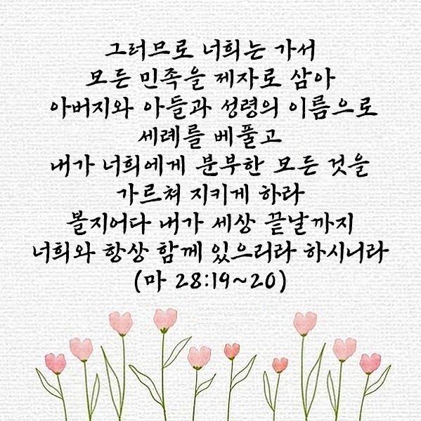 마태복음 28장 19절~20절 관리자 마태복음 0 1339 06.29 05:43 Author 0 1 Lv.71 관리자 최고관리자 311,500 (0%) 너희 안에 이 마음을 품으라 곧 그리스도 예수의 마음이니(빌립보서 2:5) Let this mind be in you, which was also in Christ Jesus(Philippians 2:5)