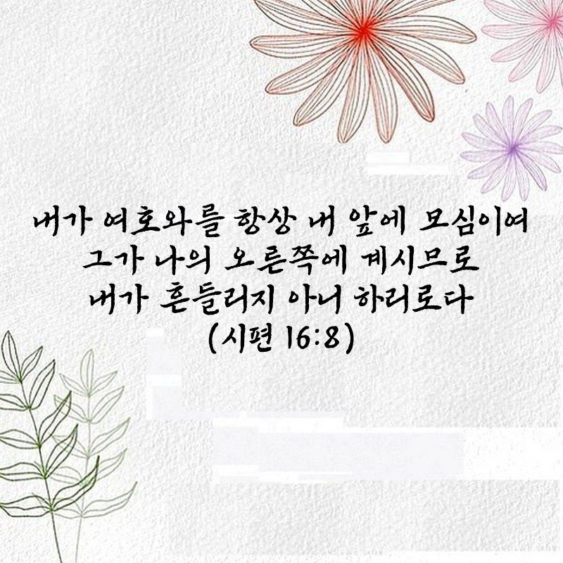 시편 16편 8절 관리자 시편 0 3011 2024.12.02 06:09 Author 0 1 Lv.71 관리자 최고관리자 311,500 (0%) 너희 안에 이 마음을 품으라 곧 그리스도 예수의 마음이니(빌립보서 2:5) Let this mind be in you, which was also in Christ Jesus(Philippians 2:5)