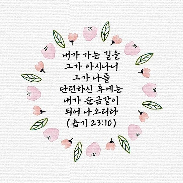 욥기 23장 10절 관리자 욥기 0 2021 2024.12.17 04:30 Author 0 1 Lv.71 관리자 최고관리자 311,500 (0%) 너희 안에 이 마음을 품으라 곧 그리스도 예수의 마음이니(빌립보서 2:5) Let this mind be in you, which was also in Christ Jesus(Philippians 2:5)