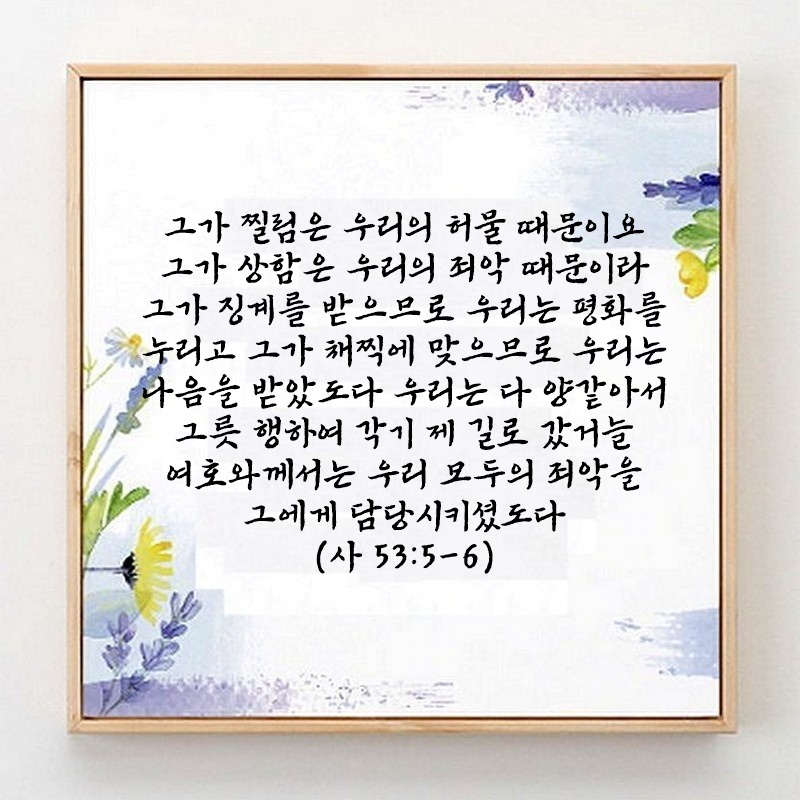 이사야 53장 5절~6절 관리자 이사야 0 2531 2024.12.07 06:02 Author 0 1 Lv.71 관리자 최고관리자 311,500 (0%) 너희 안에 이 마음을 품으라 곧 그리스도 예수의 마음이니(빌립보서 2:5) Let this mind be in you, which was also in Christ Jesus(Philippians 2:5)