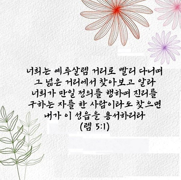 예레미야 5장 1절 관리자 예레미야 0 1243 06.29 05:50 Author 0 1 Lv.71 관리자 최고관리자 311,500 (0%) 너희 안에 이 마음을 품으라 곧 그리스도 예수의 마음이니(빌립보서 2:5) Let this mind be in you, which was also in Christ Jesus(Philippians 2:5)