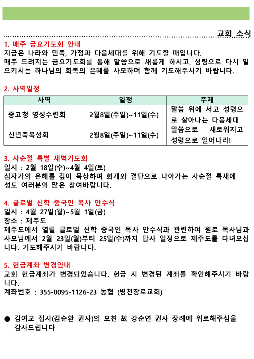 교회소식 (2026년 2월 8일 주일) 관리자 0 296 02.08 11:35 Author 1 1 Lv.76 관리자 최고관리자 357,680 (60.9%) 너희 안에 이 마음을 품으라 곧 그리스도 예수의 마음이니(빌립보서 2:5) Let this mind be in you, which was also in Christ Jesus(Philippians 2:5)