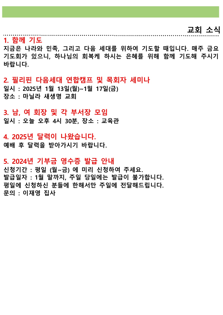 교회소식 (2025년 1월 12일 주일) 관리자 0 1695 01.12 14:07 2025년 1월 12일 (주일) 교회소식입니다. Author 0 1 Lv.71 관리자 최고관리자 311,800 (3.7%) 너희 안에 이 마음을 품으라 곧 그리스도 예수의 마음이니(빌립보서 2:5) Let this mind be in you, which was also in Christ Jesus(Philippians 2:5)