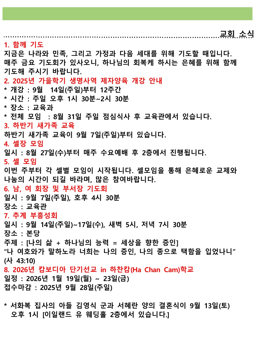 교회소식 (2025년 8월 31일 주일) 관리자 0 533 08.31 16:42 Author 0 1 Lv.71 관리자 최고관리자 311,500 (0%) 너희 안에 이 마음을 품으라 곧 그리스도 예수의 마음이니(빌립보서 2:5) Let this mind be in you, which was also in Christ Jesus(Philippians 2:5)