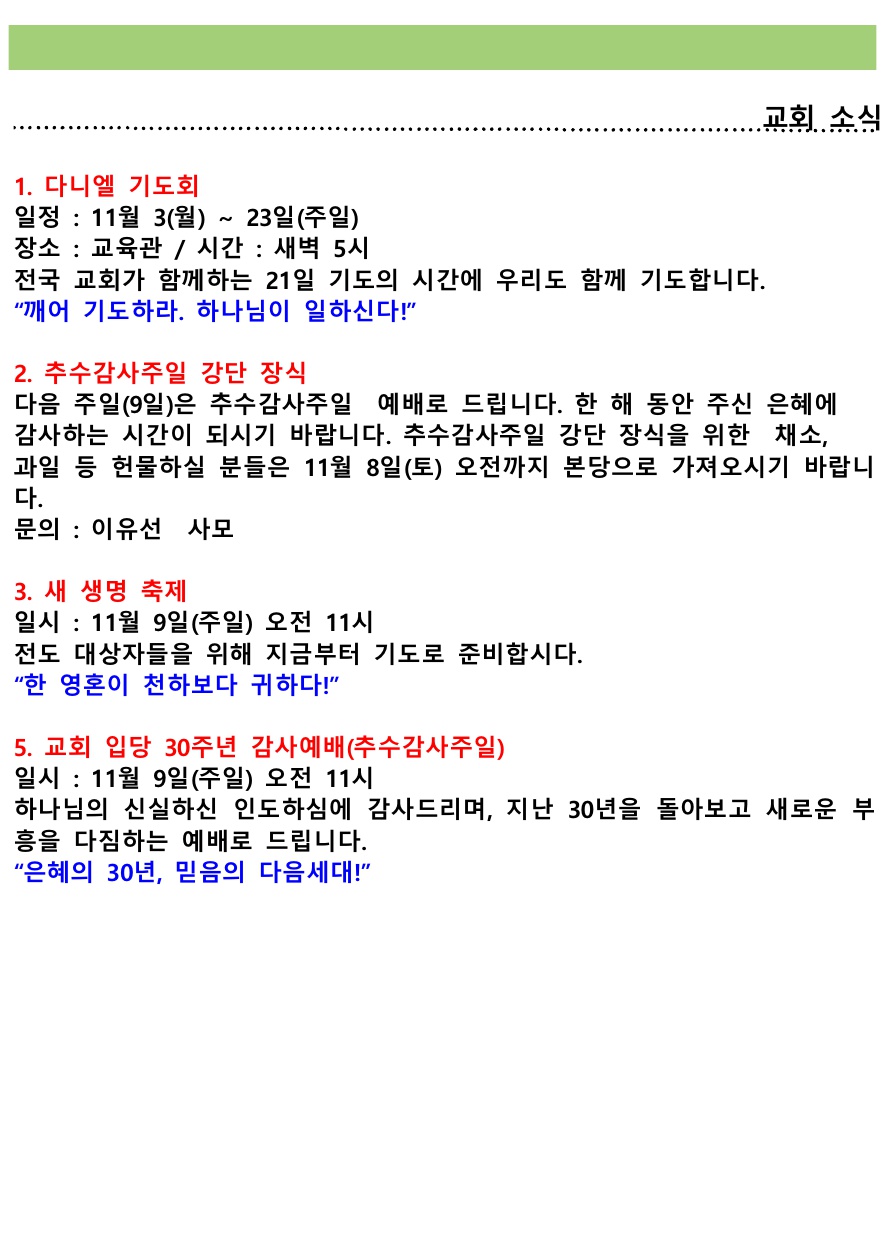 교회소식 (2025년 11월 2일 주일) 관리자 0 168 11.02 15:33 Author 0 1 Lv.71 관리자 최고관리자 311,500 (0%) 너희 안에 이 마음을 품으라 곧 그리스도 예수의 마음이니(빌립보서 2:5) Let this mind be in you, which was also in Christ Jesus(Philippians 2:5)