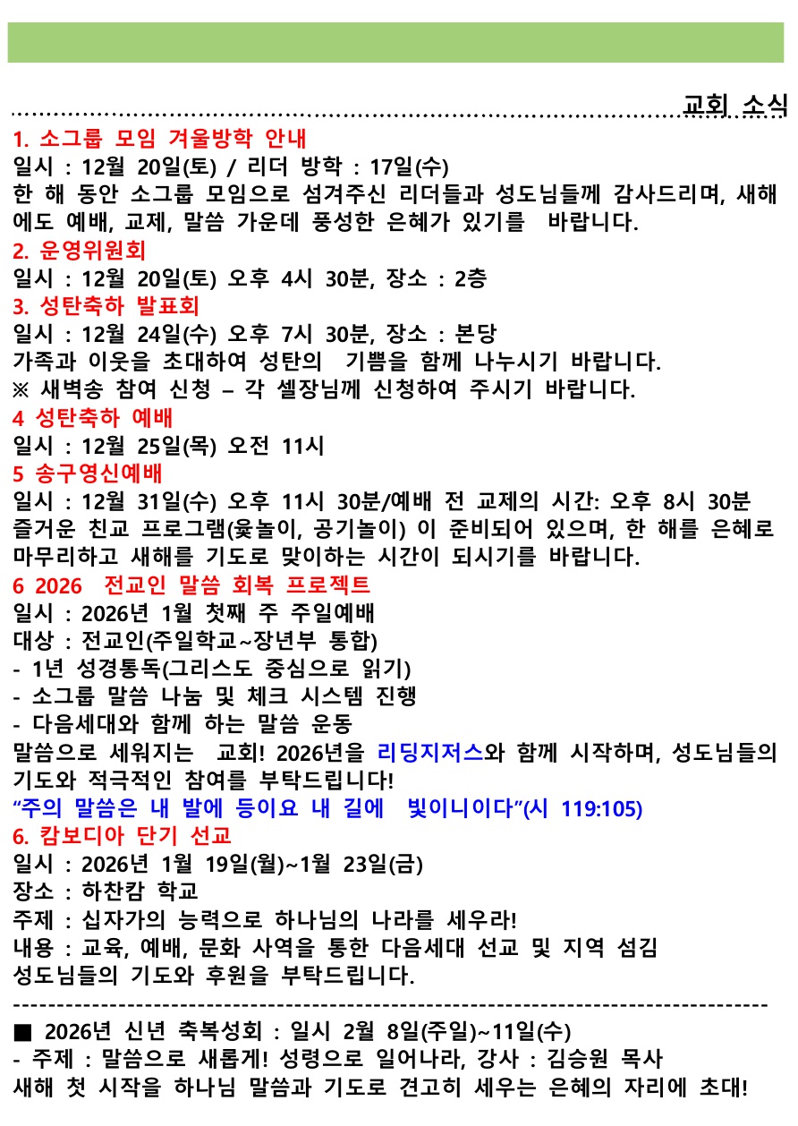 교회소식 (2025년 12월 14일 주일) 관리자 0 236 2025.12.14 15:46 Author 0 1 Lv.73 관리자 최고관리자 329,180 (19.2%) 너희 안에 이 마음을 품으라 곧 그리스도 예수의 마음이니(빌립보서 2:5) Let this mind be in you, which was also in Christ Jesus(Philippians 2:5)