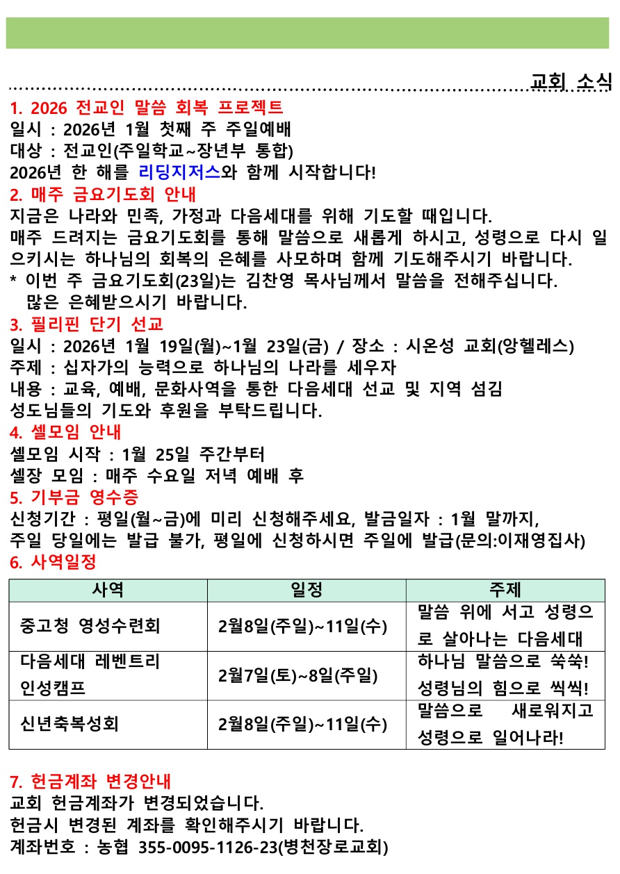 교회소식 (2026년 1월 18일 주일) 관리자 0 335 01.18 13:56 Author 1 1 Lv.76 관리자 최고관리자 357,680 (60.9%) 너희 안에 이 마음을 품으라 곧 그리스도 예수의 마음이니(빌립보서 2:5) Let this mind be in you, which was also in Christ Jesus(Philippians 2:5)