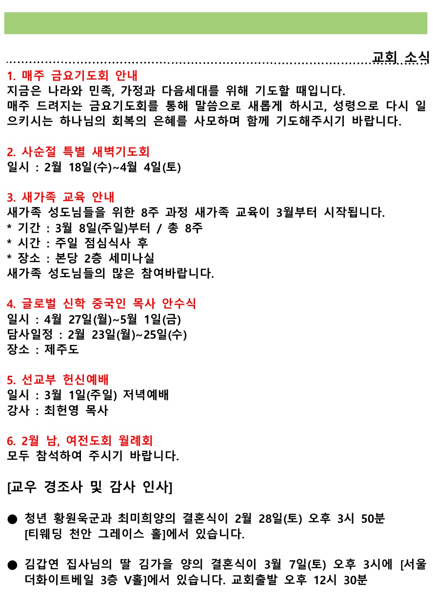 교회소식 (2026년 2월 22일 주일) 관리자 0 214 02.22 14:01 Author 1 1 Lv.76 관리자 최고관리자 357,680 (60.9%) 너희 안에 이 마음을 품으라 곧 그리스도 예수의 마음이니(빌립보서 2:5) Let this mind be in you, which was also in Christ Jesus(Philippians 2:5)