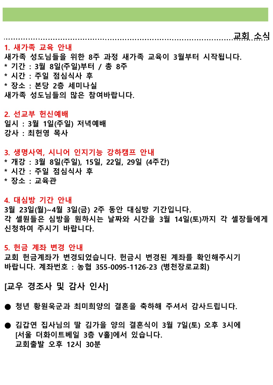 교회소식 (2026년 3월 1일 주일) 관리자 0 139 03.01 23:47 Author 1 1 Lv.76 관리자 최고관리자 357,680 (60.9%) 너희 안에 이 마음을 품으라 곧 그리스도 예수의 마음이니(빌립보서 2:5) Let this mind be in you, which was also in Christ Jesus(Philippians 2:5)