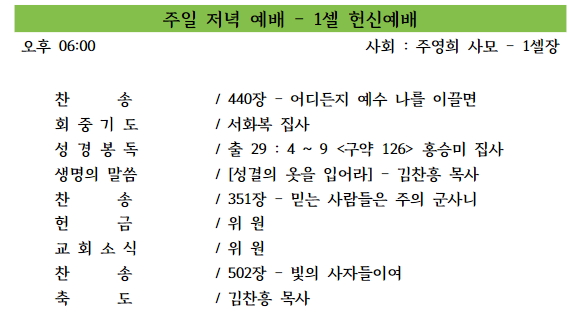 1셀장 : 권옥순 권사 / 2셀장 : 김영오 권사 / 3셀장 : 유춘희 권사 / 4셀장 : 김정란 권사 / 5셀장 : 이유선 사모 / 6셀장 : 윤태호 집사