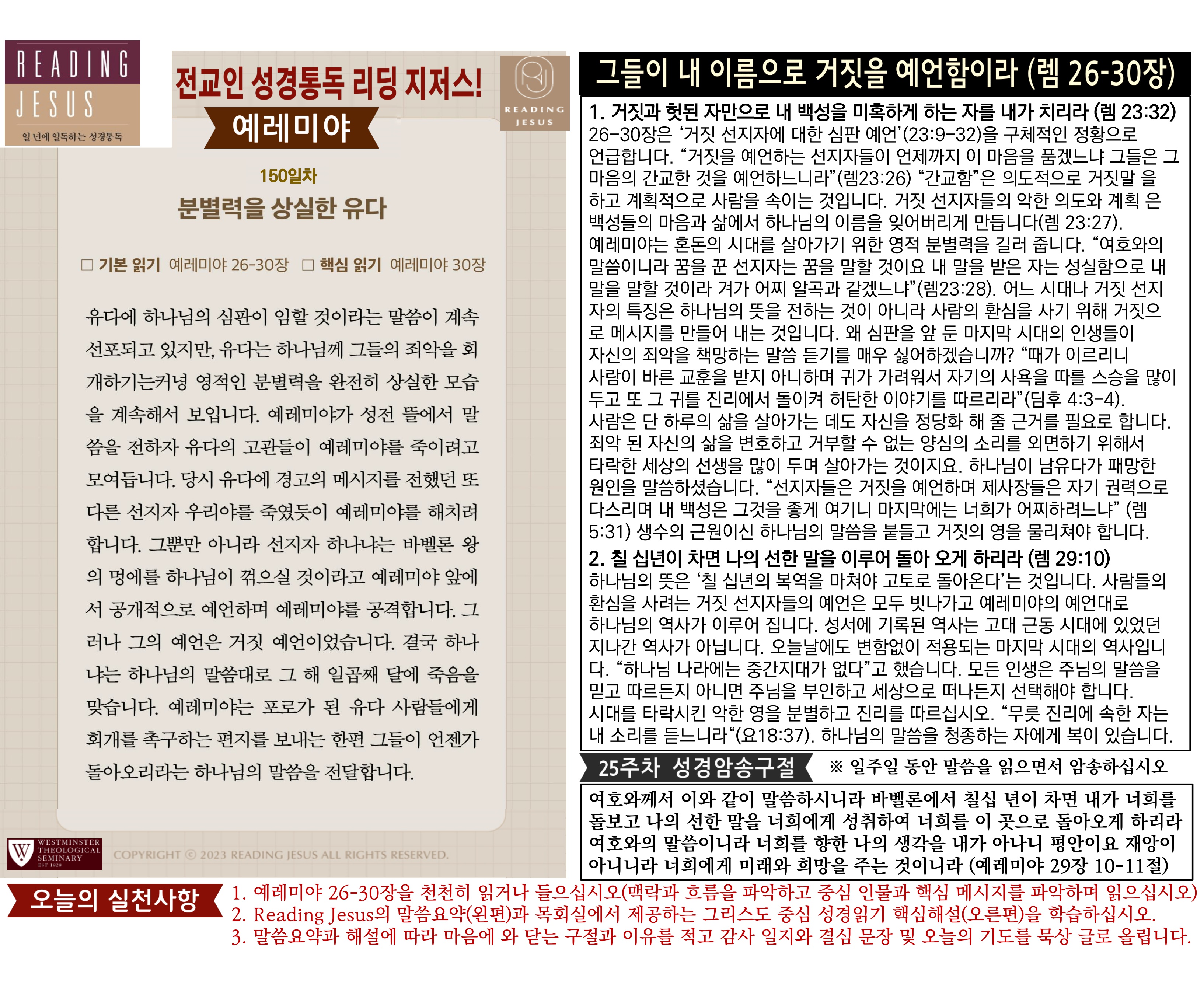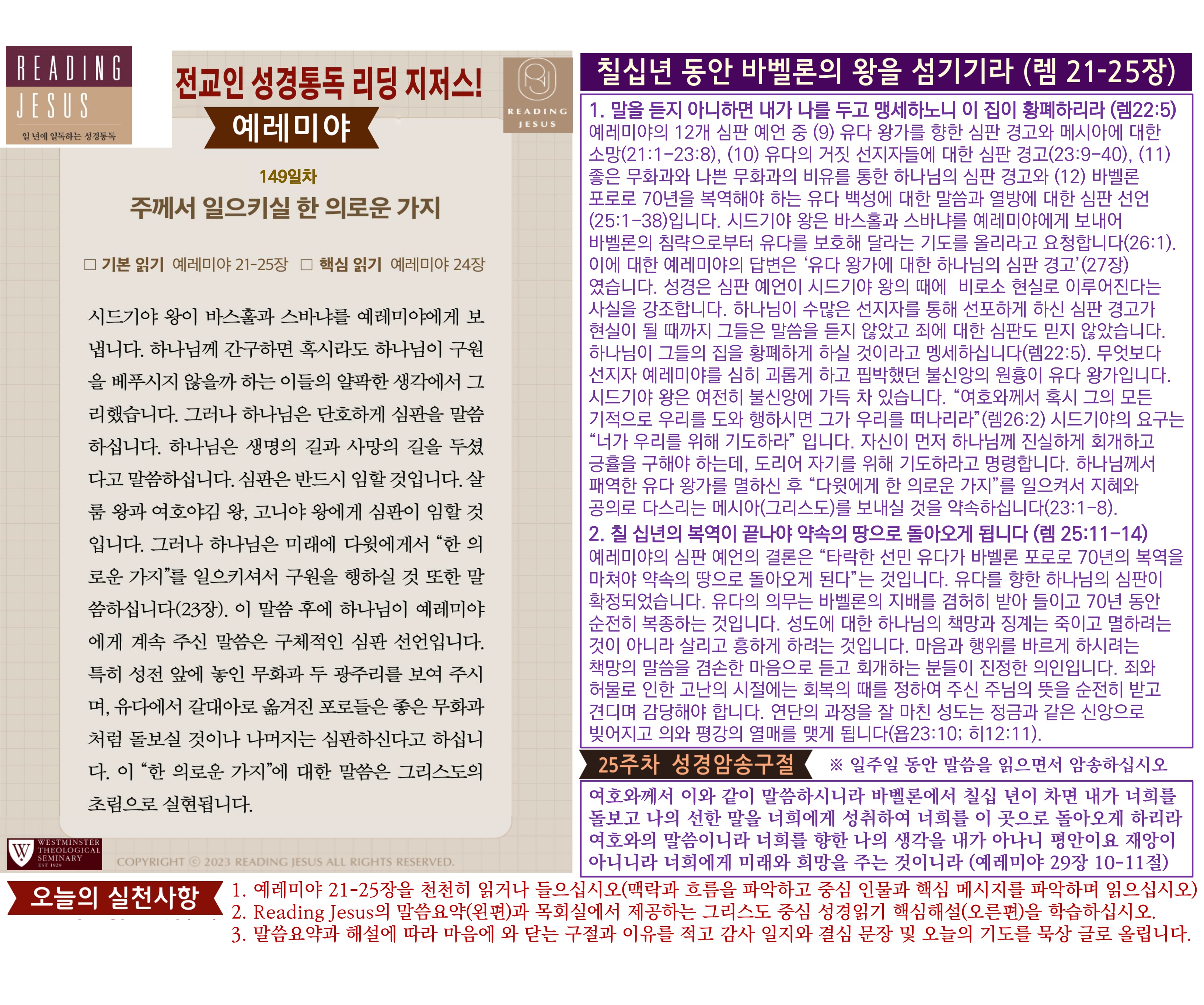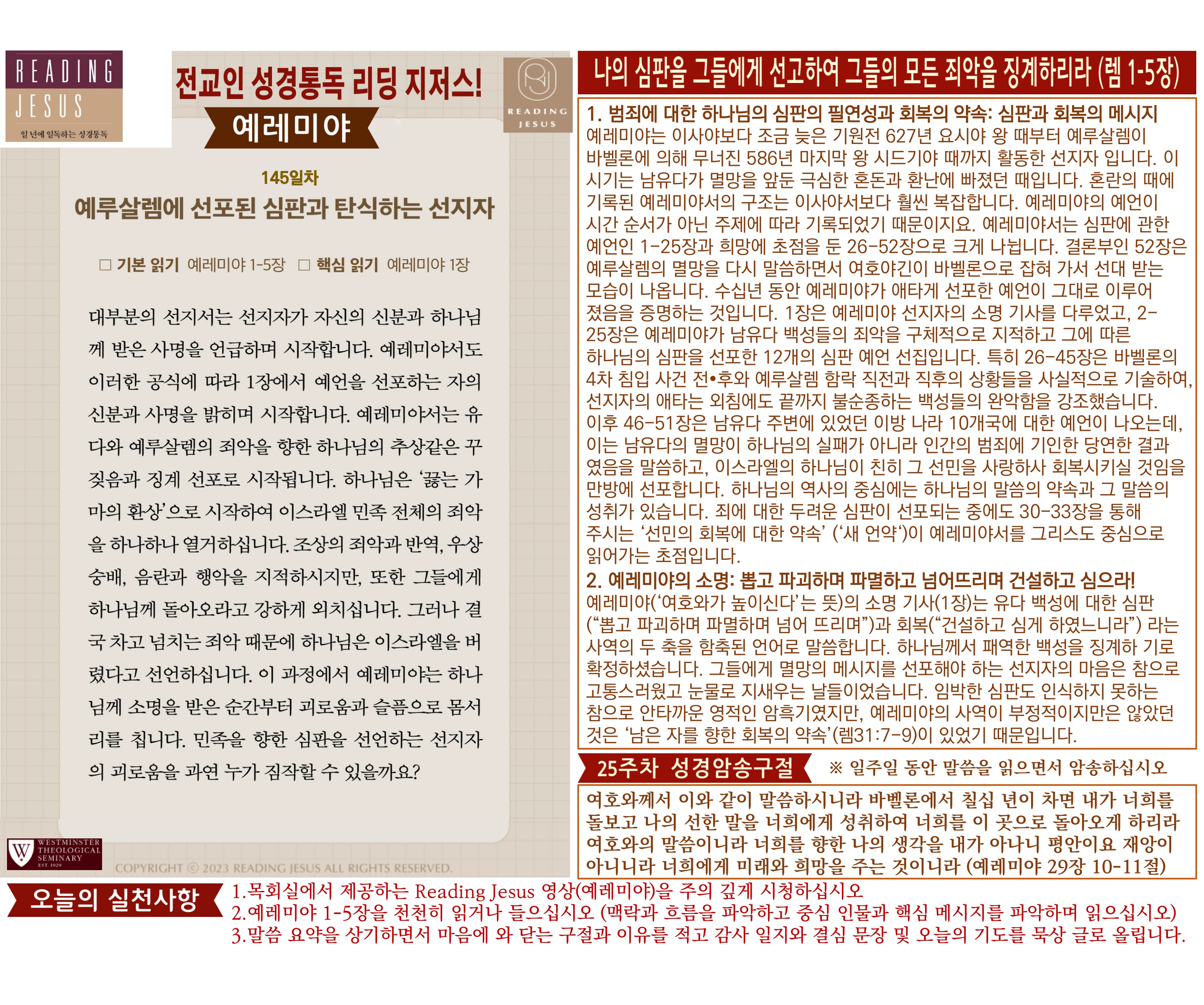 그리스도 중심 성경읽기, 리딩지저스 말씀 요약 | 25주차 : 예레미야 1 관리자 교재와 해설 0 11 04.05 03:42 Author 1 1 Lv.77 관리자 최고관리자 369,330 (96.8%) 너희 안에 이 마음을 품으라 곧 그리스도 예수의 마음이니(빌립보서 2:5) Let this mind be in you, which was also in Christ Jesus(Philippians 2:5)
