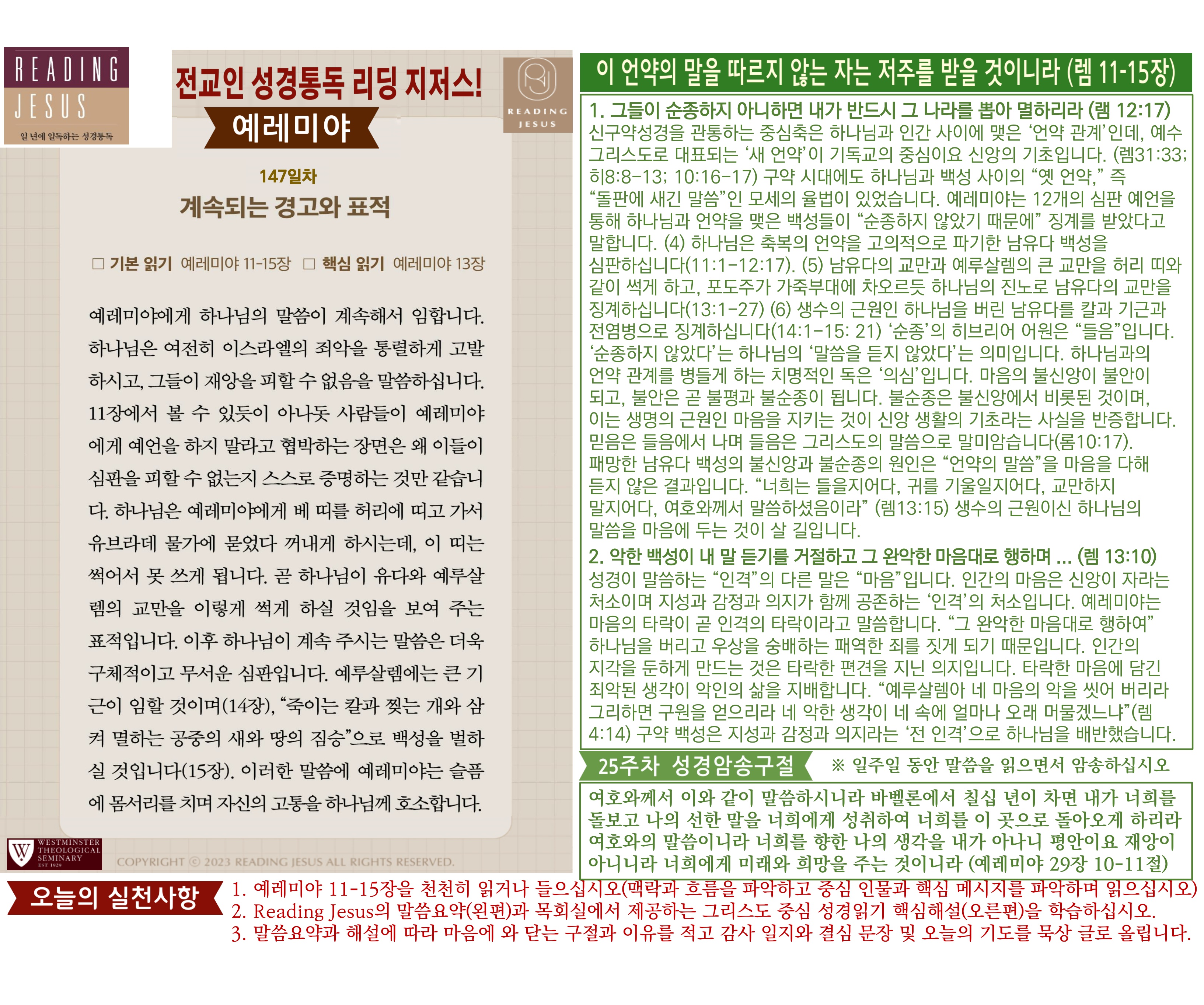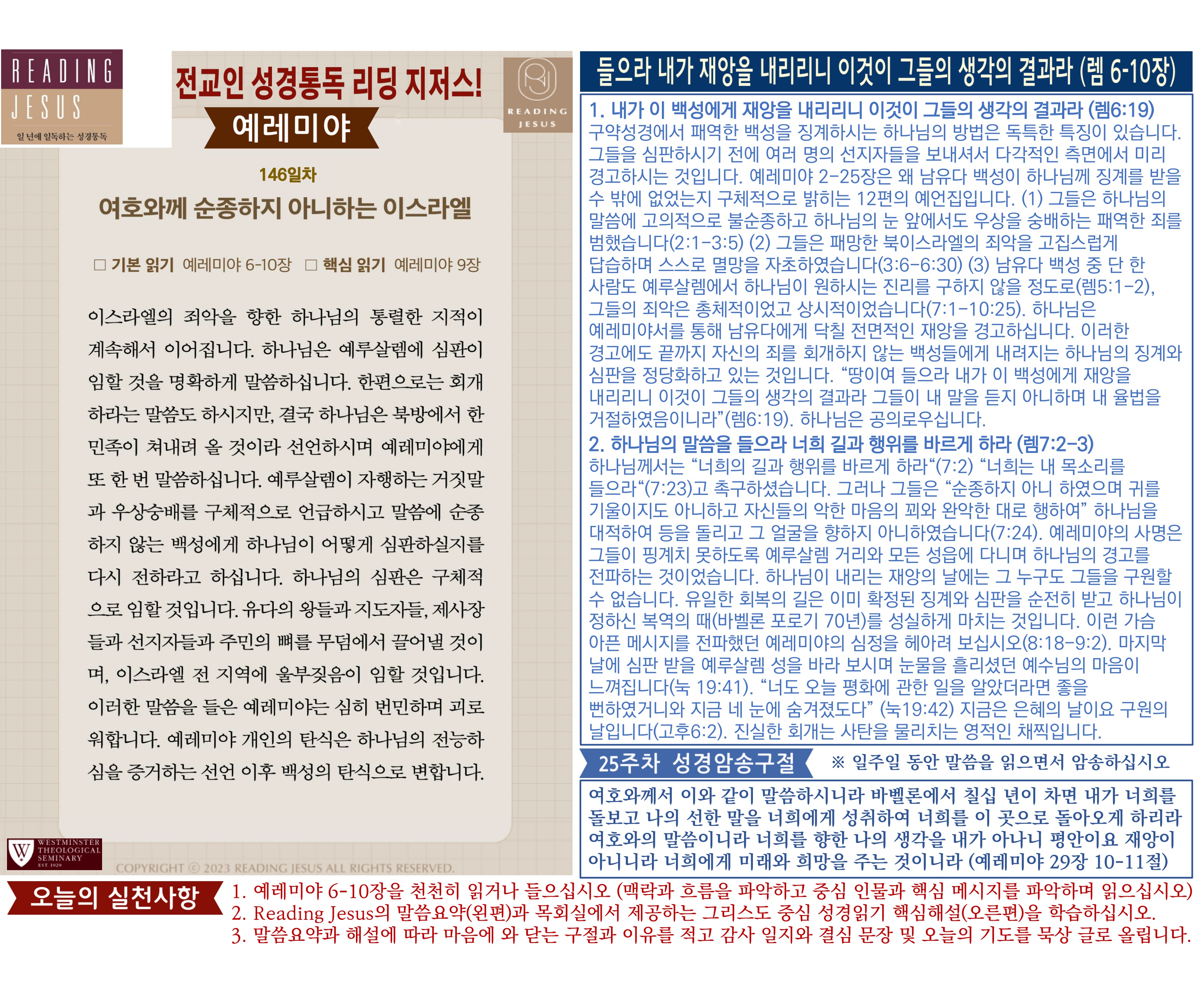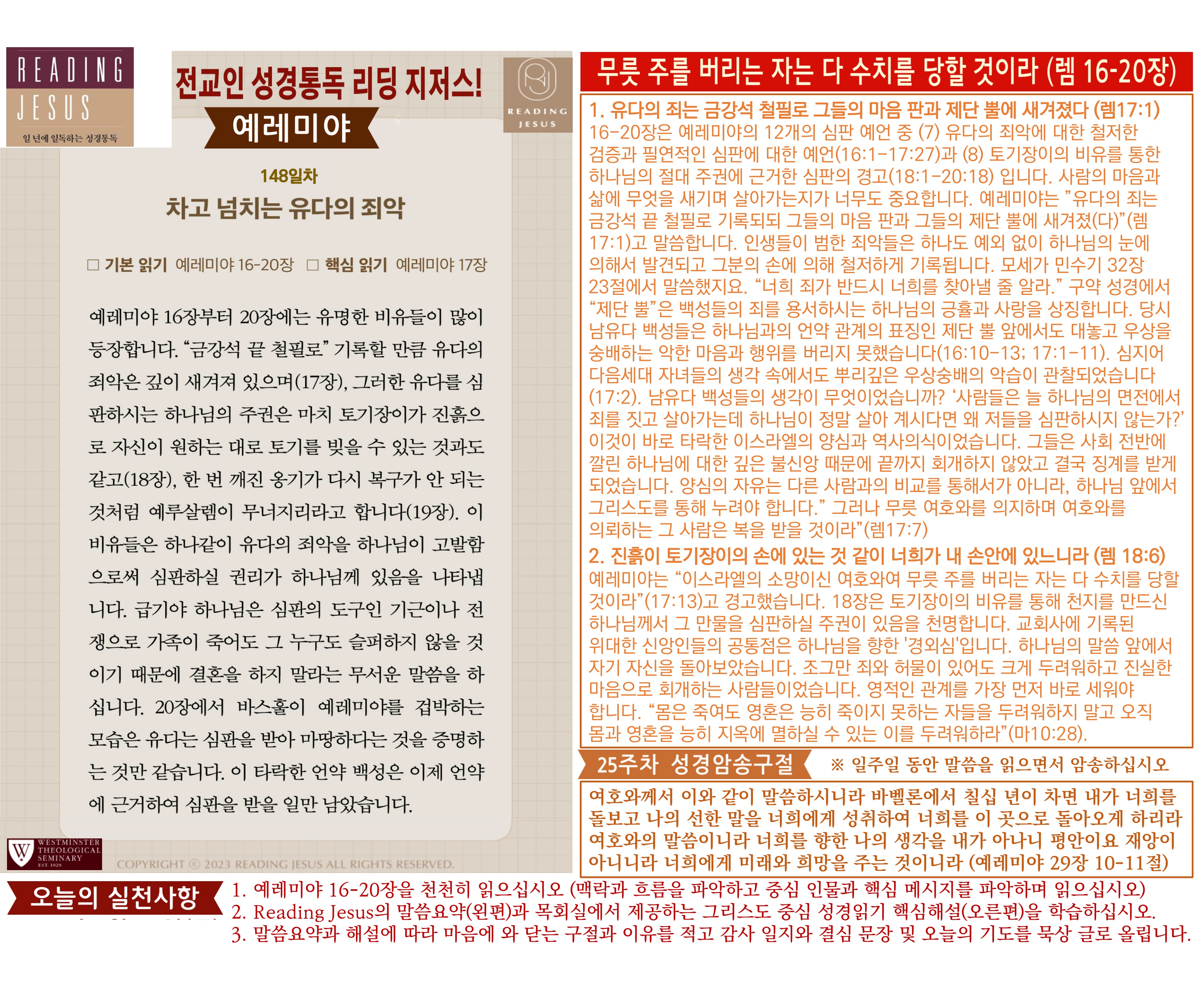 그리스도 중심 성경읽기, 리딩지저스 말씀 요약 | 25주차 : 예레미야 1 관리자 교재와 해설 0 11 04.05 03:42 Author 1 1 Lv.77 관리자 최고관리자 369,330 (96.8%) 너희 안에 이 마음을 품으라 곧 그리스도 예수의 마음이니(빌립보서 2:5) Let this mind be in you, which was also in Christ Jesus(Philippians 2:5)