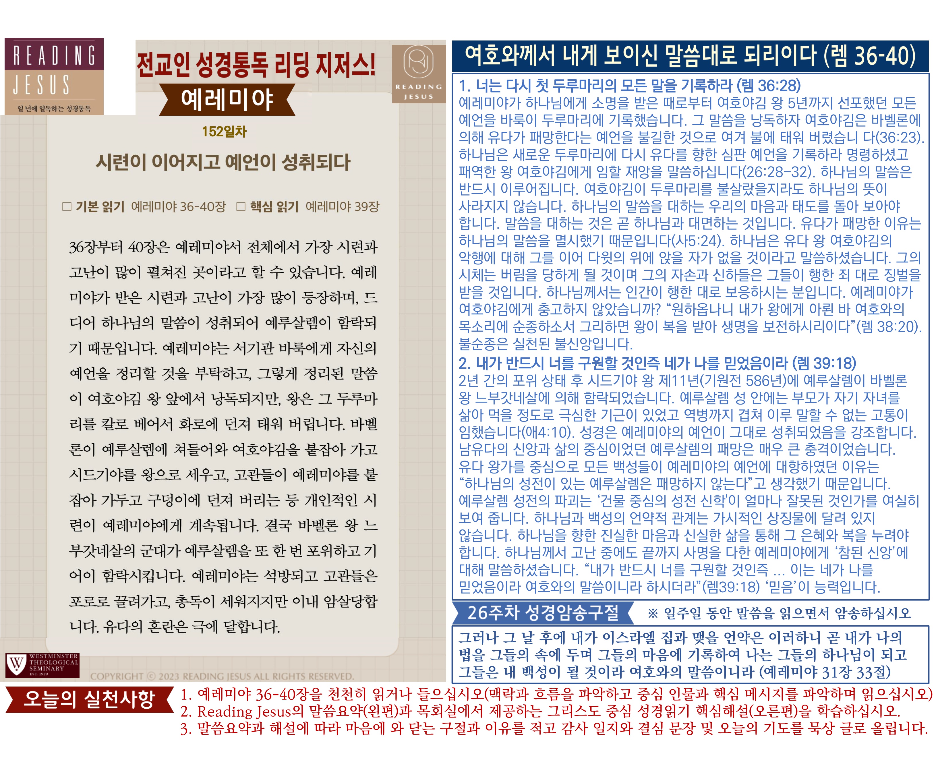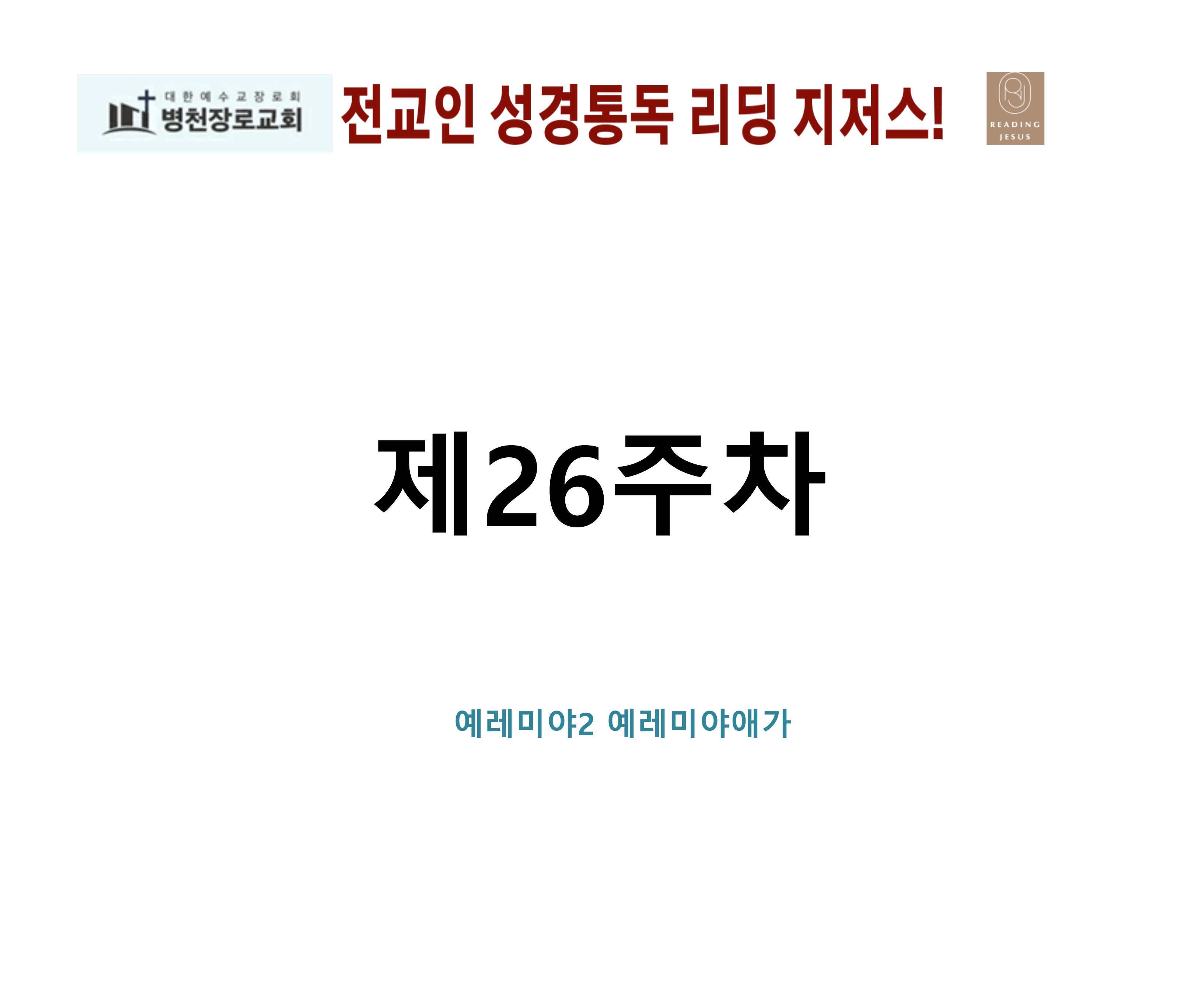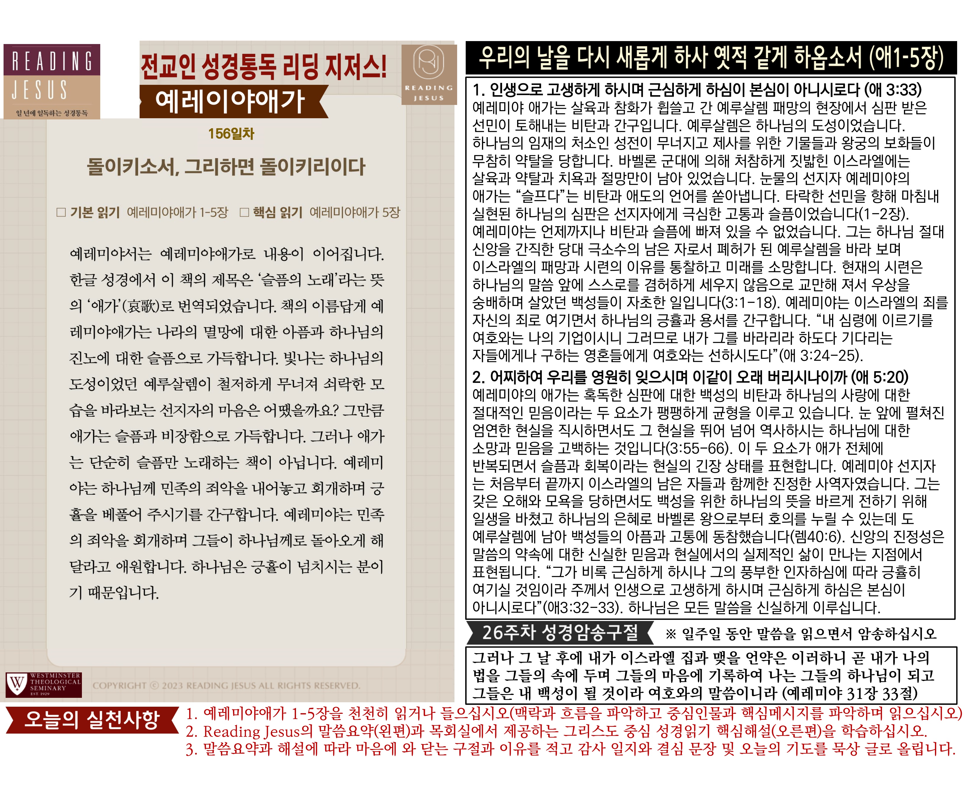 그리스도 중심 성경읽기, 리딩지저스 말씀 요약 | 26주차 : 예레미야 2, 예레미야애가 관리자 교재와 해설 0 10 04.05 03:44 Author 1 1 Lv.77 관리자 최고관리자 369,330 (96.8%) 너희 안에 이 마음을 품으라 곧 그리스도 예수의 마음이니(빌립보서 2:5) Let this mind be in you, which was also in Christ Jesus(Philippians 2:5)