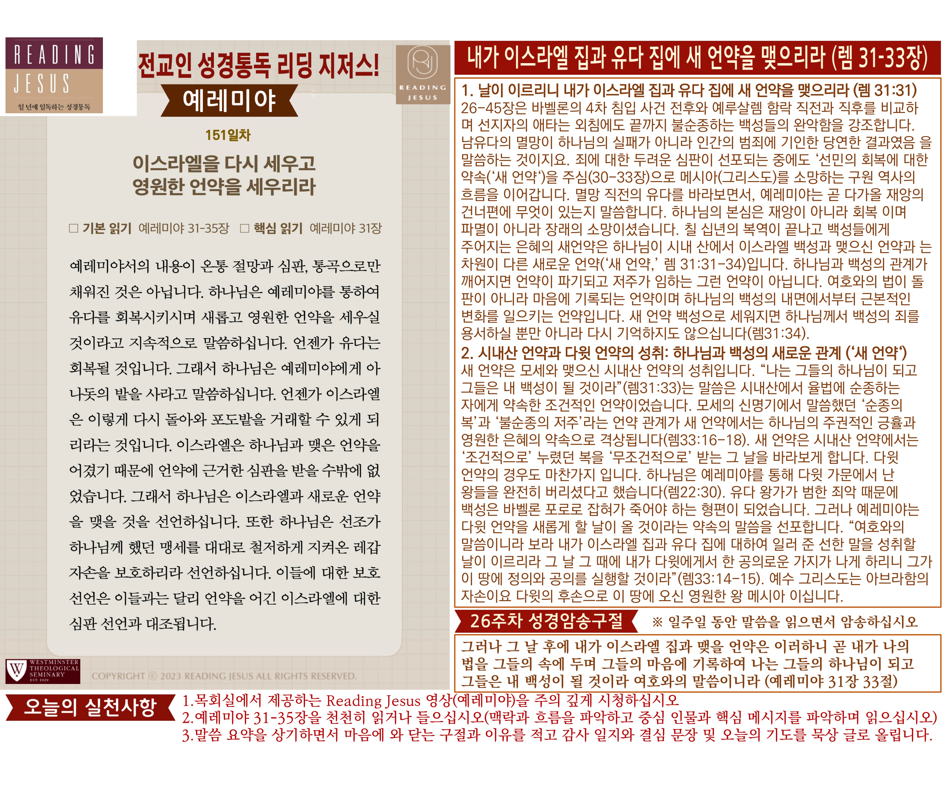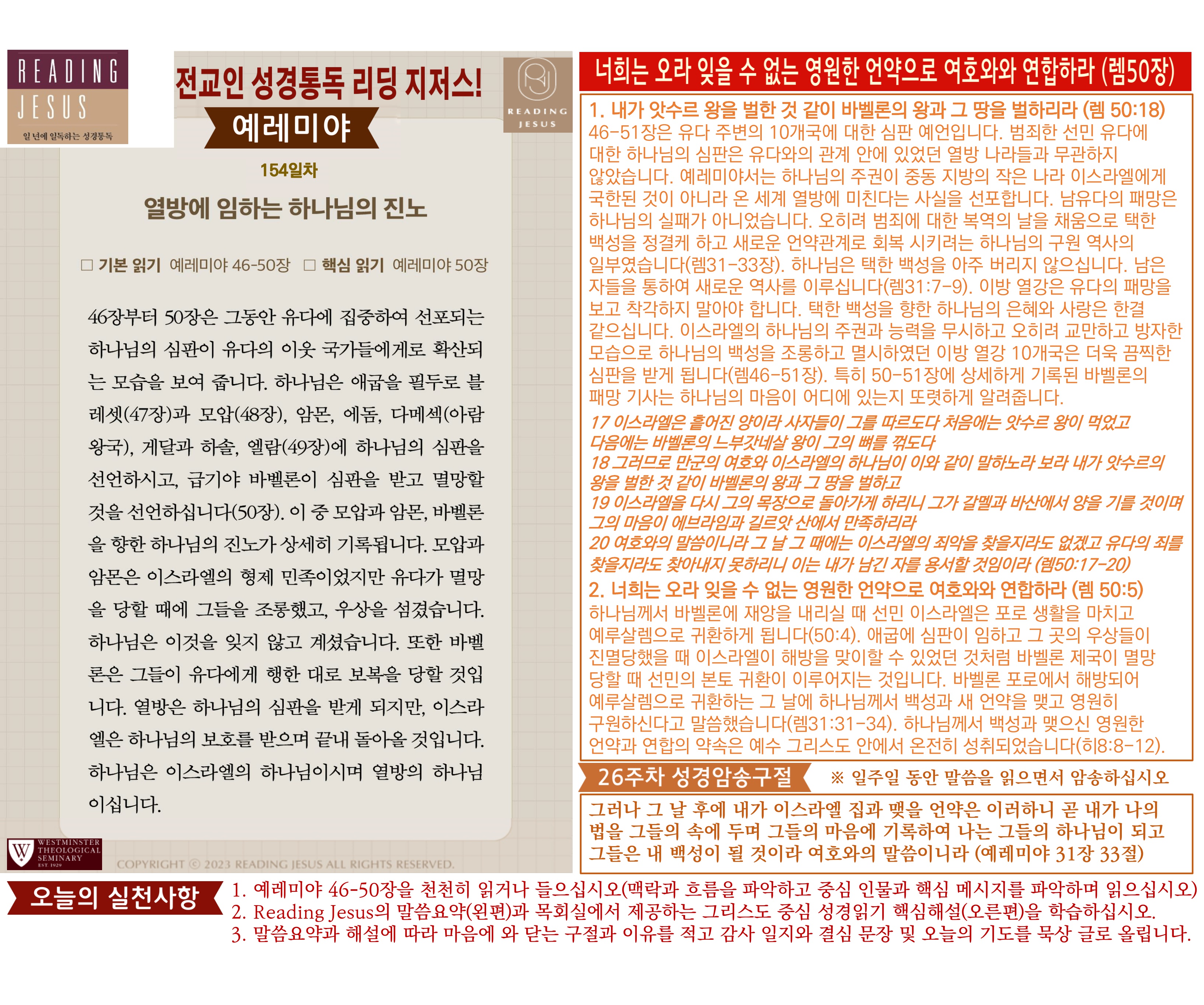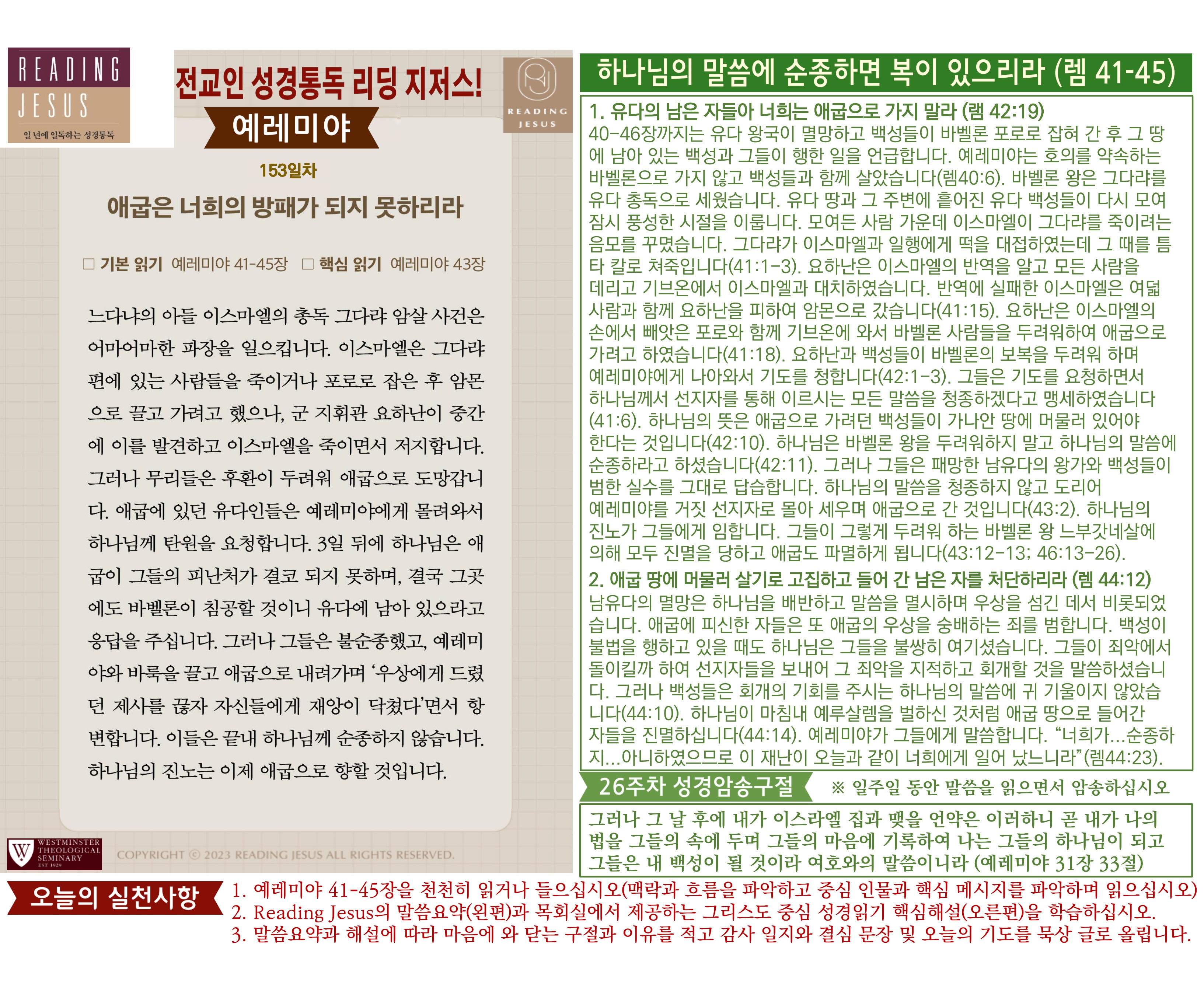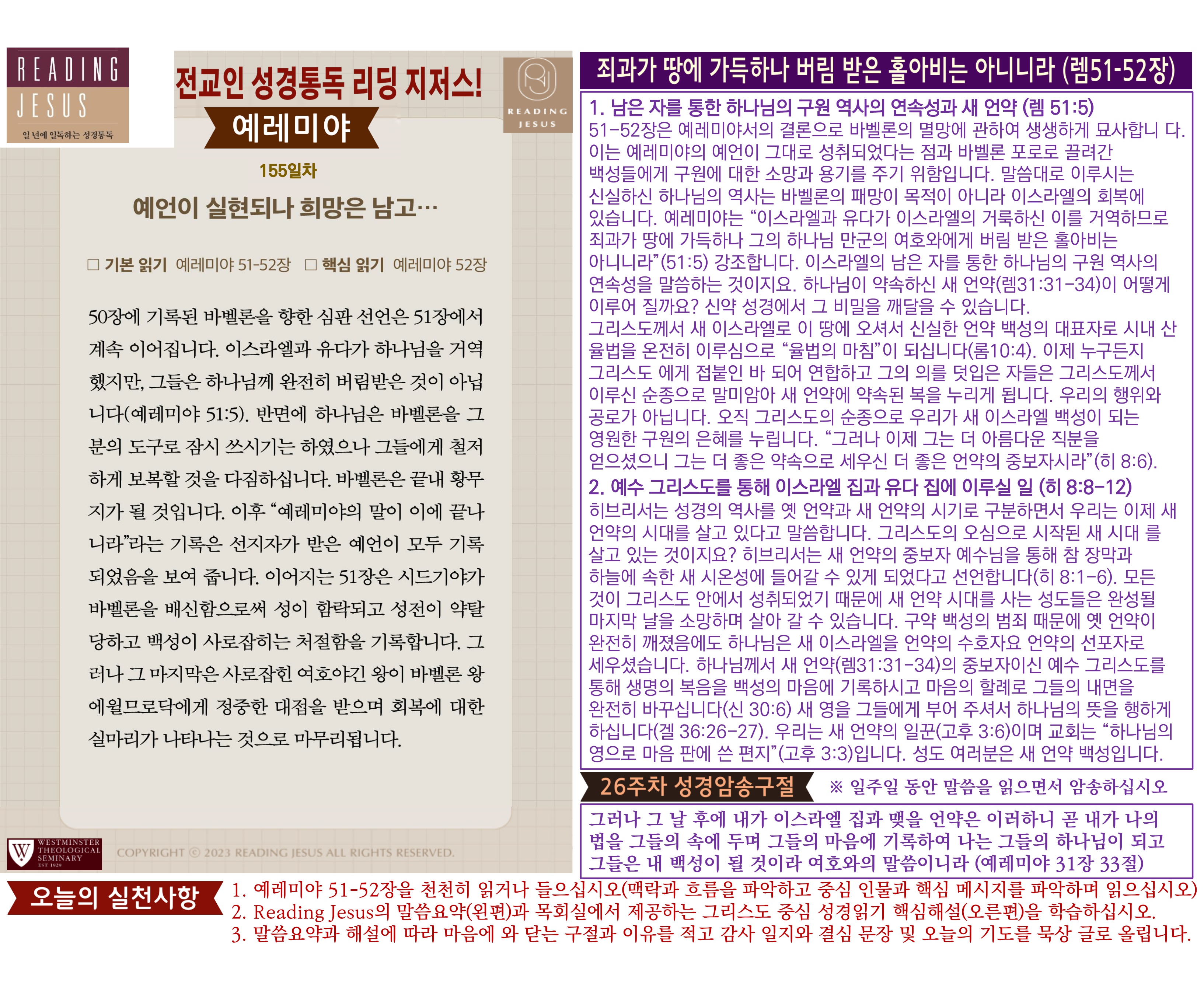 그리스도 중심 성경읽기, 리딩지저스 말씀 요약 | 26주차 : 예레미야 2, 예레미야애가 관리자 교재와 해설 0 10 04.05 03:44 Author 1 1 Lv.77 관리자 최고관리자 369,330 (96.8%) 너희 안에 이 마음을 품으라 곧 그리스도 예수의 마음이니(빌립보서 2:5) Let this mind be in you, which was also in Christ Jesus(Philippians 2:5)