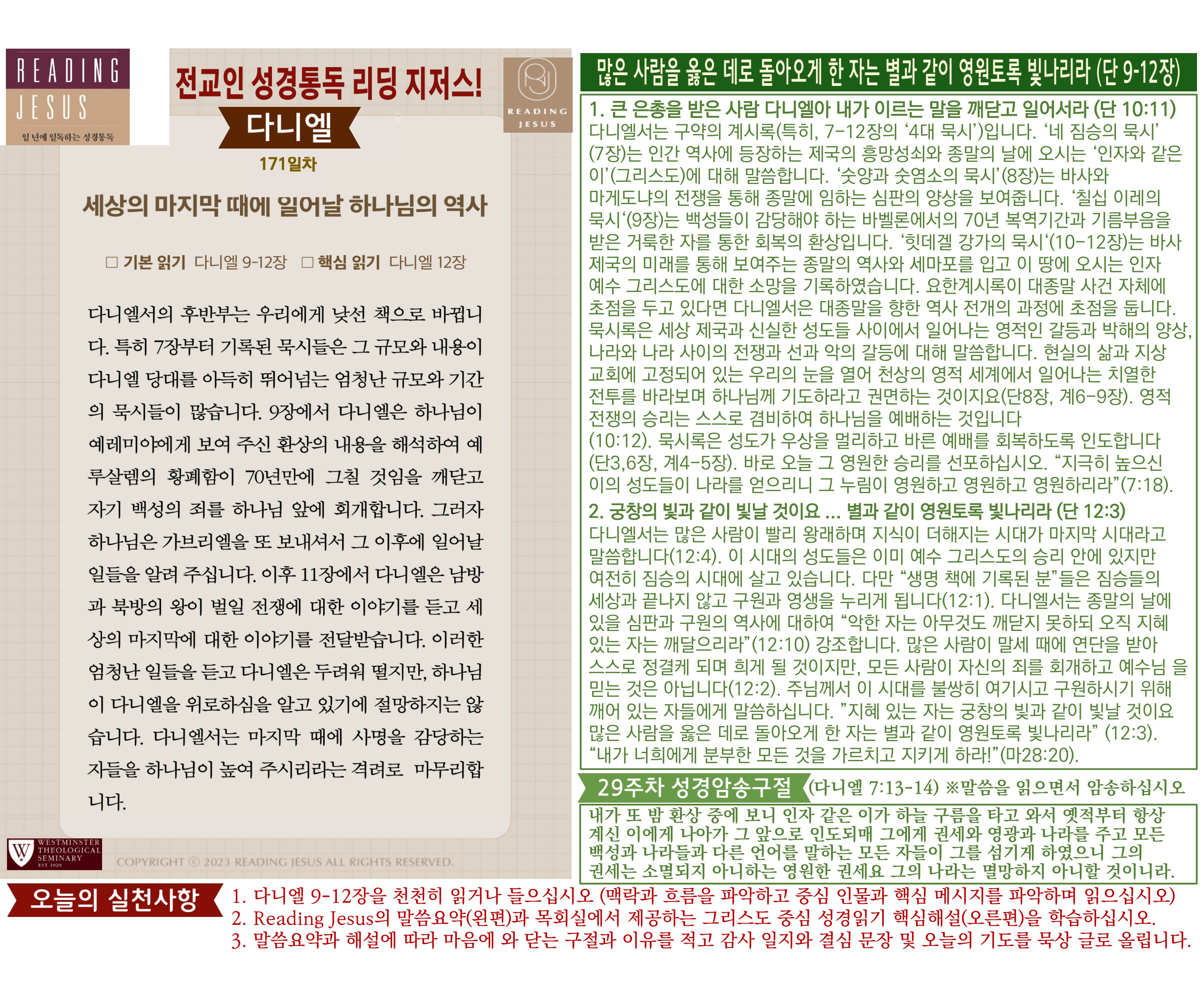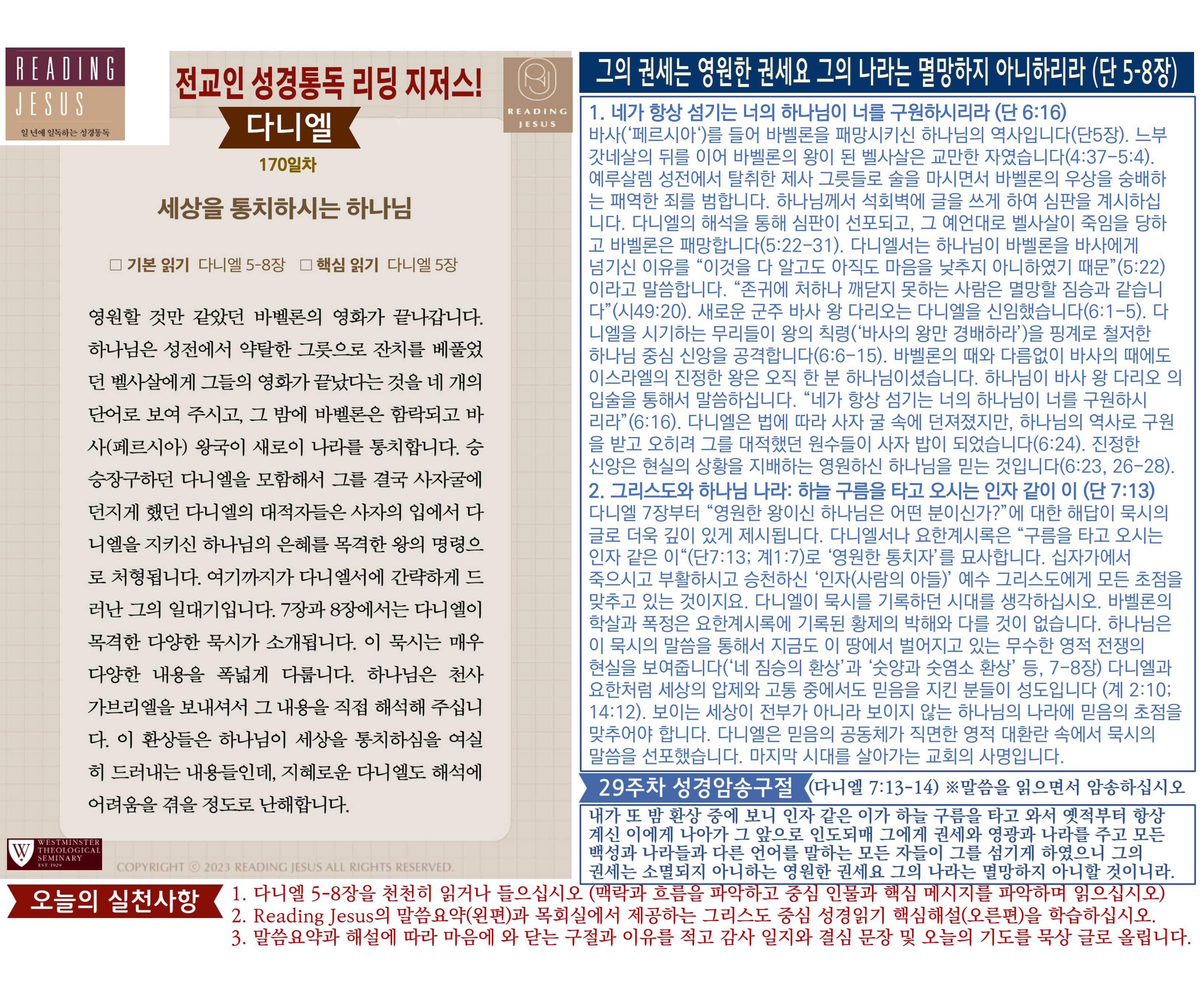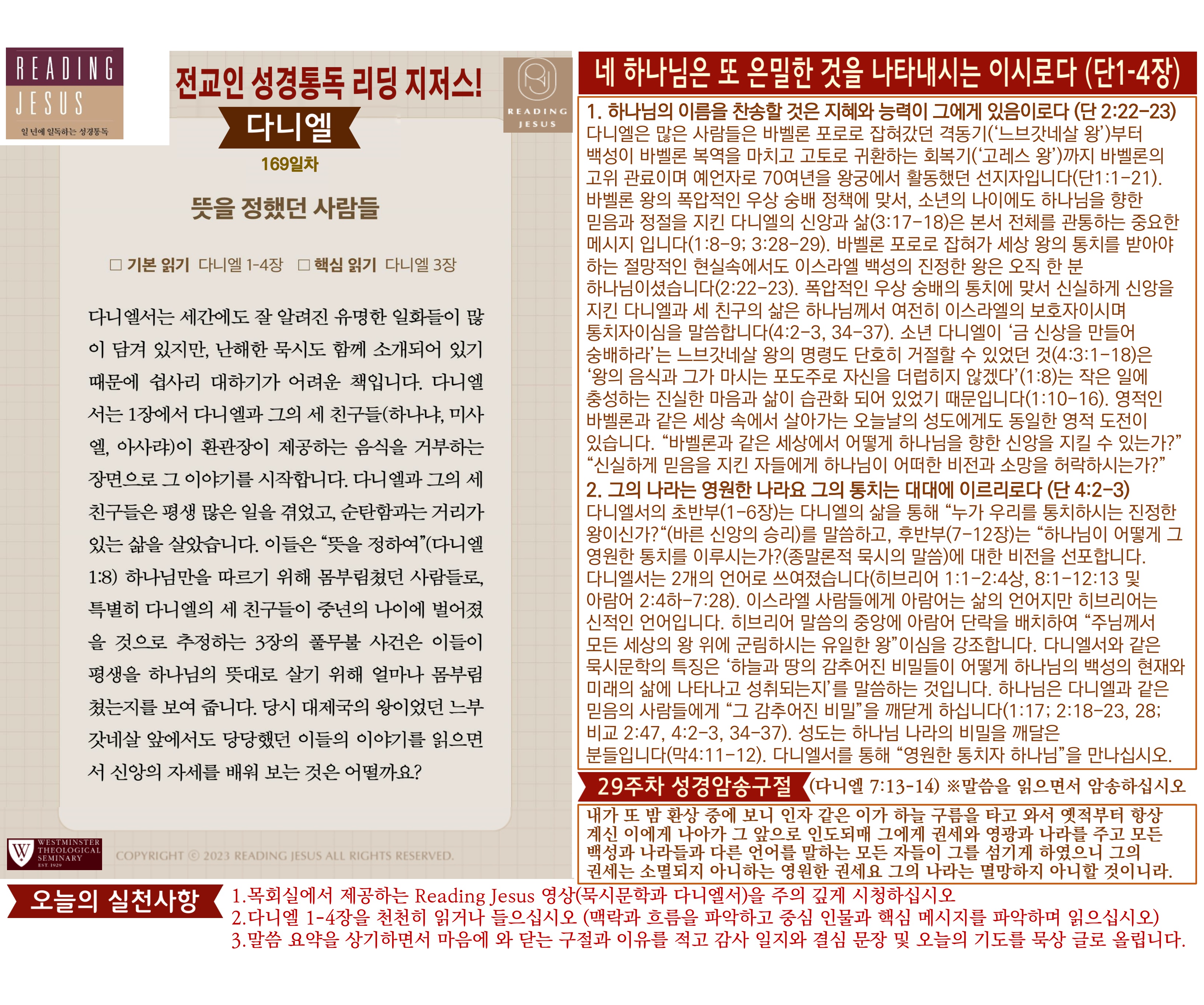 그리스도 중심 성경읽기, 리딩지저스 말씀 요약 | 29주차 : 다니엘, 호세아 관리자 교재와 해설 0 3 4시간전 Author 1 1 Lv.77 관리자 최고관리자 369,330 (96.8%) 너희 안에 이 마음을 품으라 곧 그리스도 예수의 마음이니(빌립보서 2:5) Let this mind be in you, which was also in Christ Jesus(Philippians 2:5)