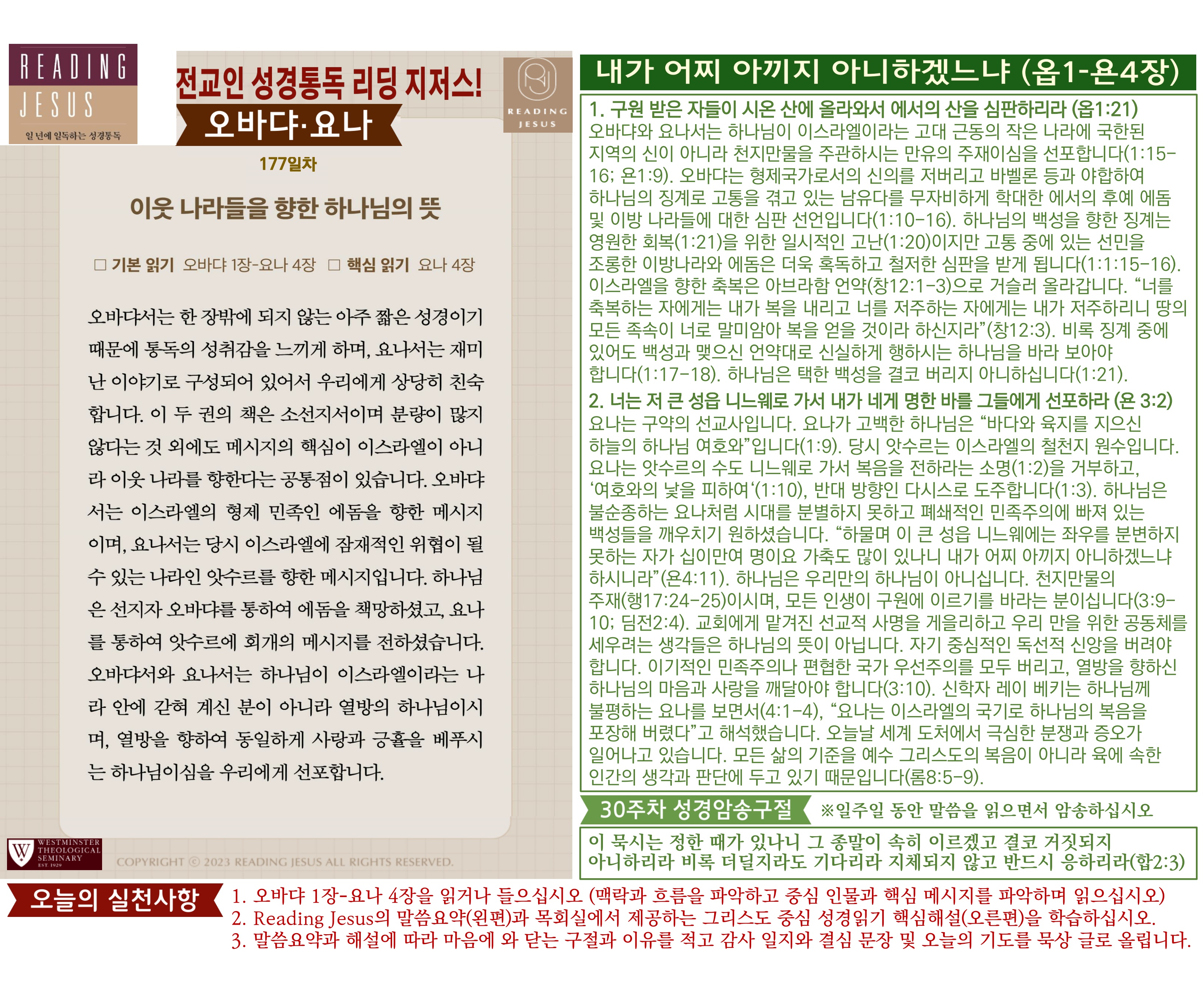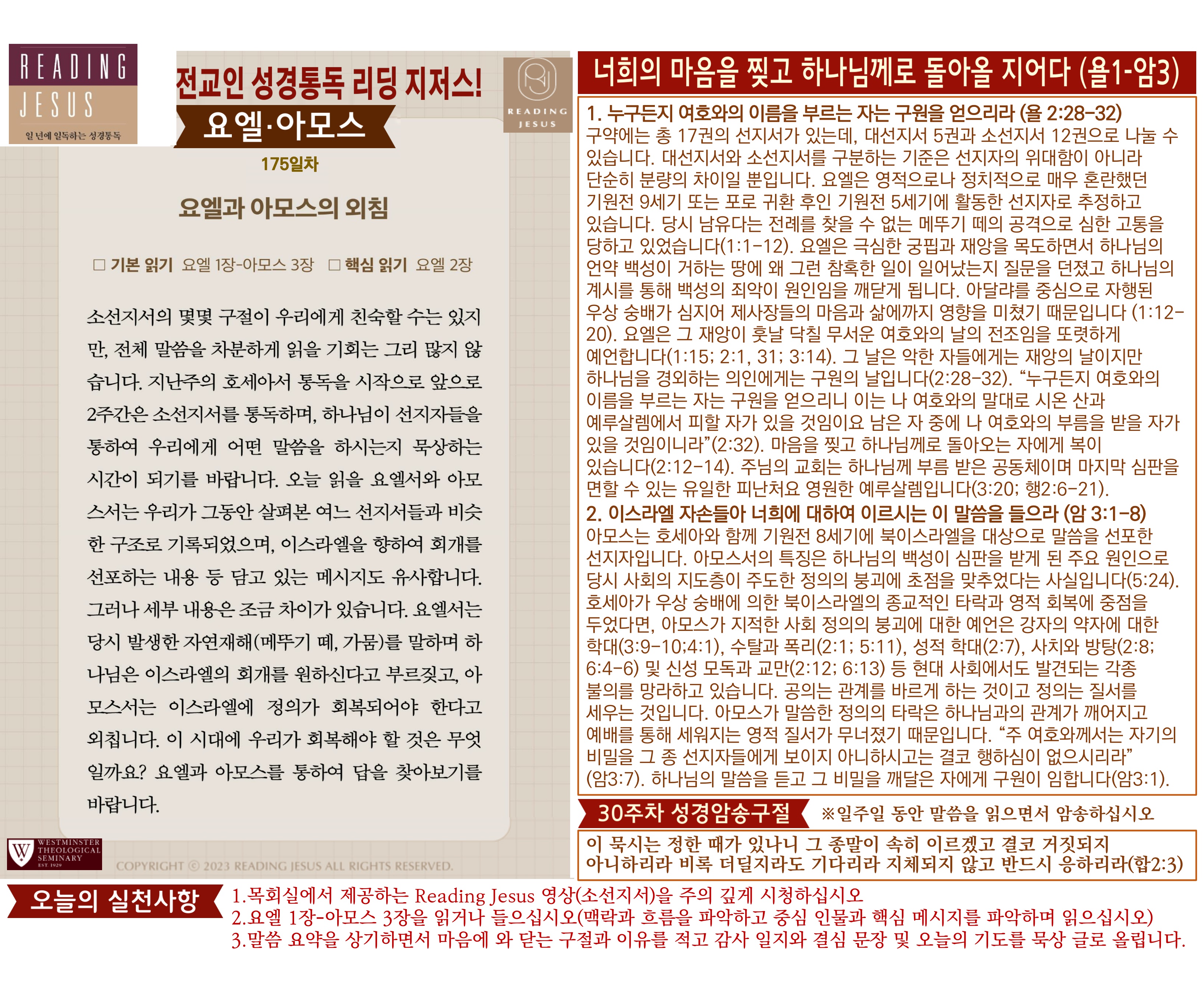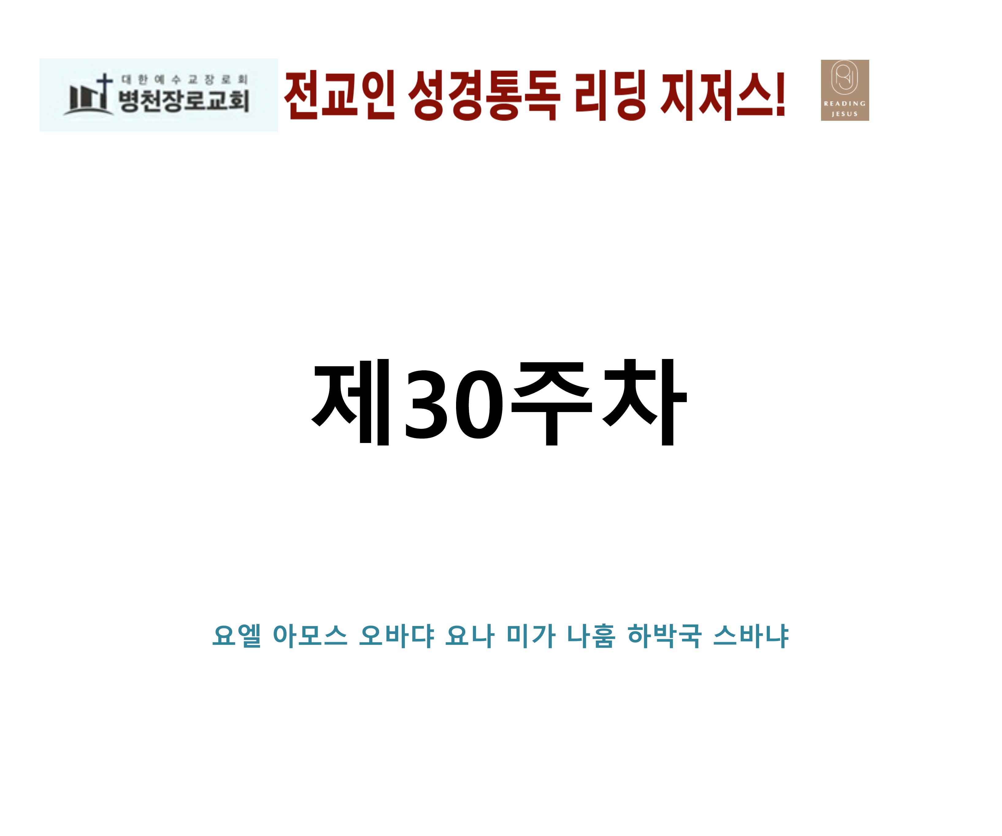 그리스도 중심 성경읽기, 리딩지저스 말씀 요약 | 30주차 : 요엘 아모스 오바댜 요나 미가 나훔 하박국 스바냐 관리자 교재와 해설 0 3 4시간전 그리스도 중심 성경읽기, 리딩지저스 말씀 요약 | 30주차 : 요엘 아모스 오바댜 요나 미가 나훔 하박국 스바냐 Author 1 1 Lv.77 관리자 최고관리자 369,330 (96.8%) 너희 안에 이 마음을 품으라 곧 그리스도 예수의 마음이니(빌립보서 2:5) Let this mind be in you, which was also in Christ Jesus(Philippians 2:5)