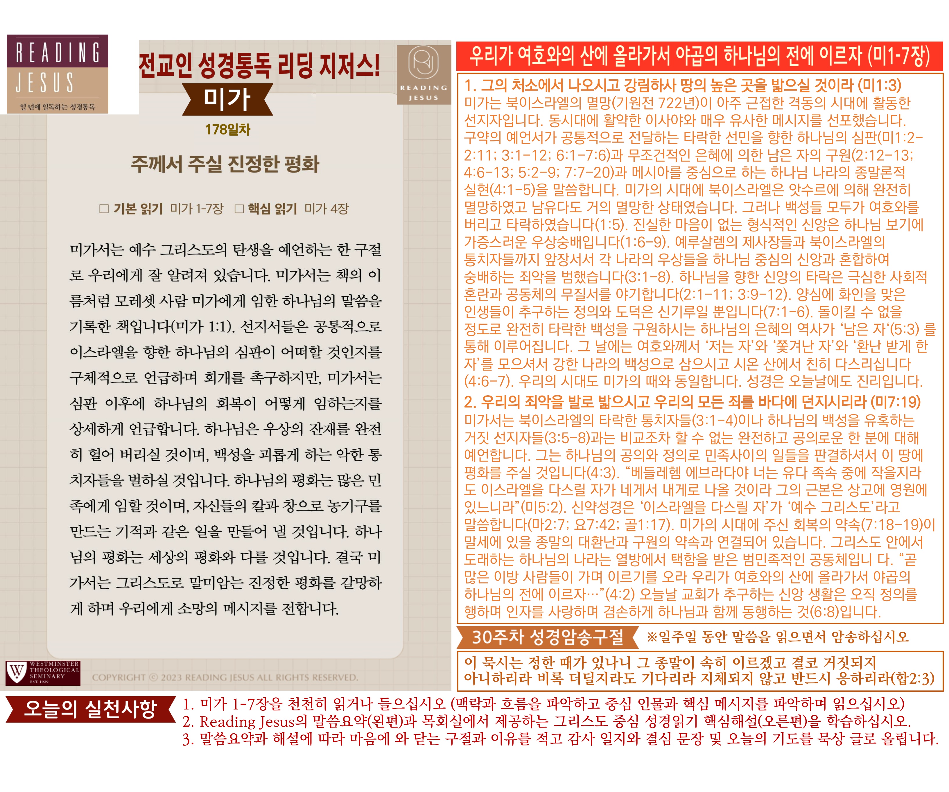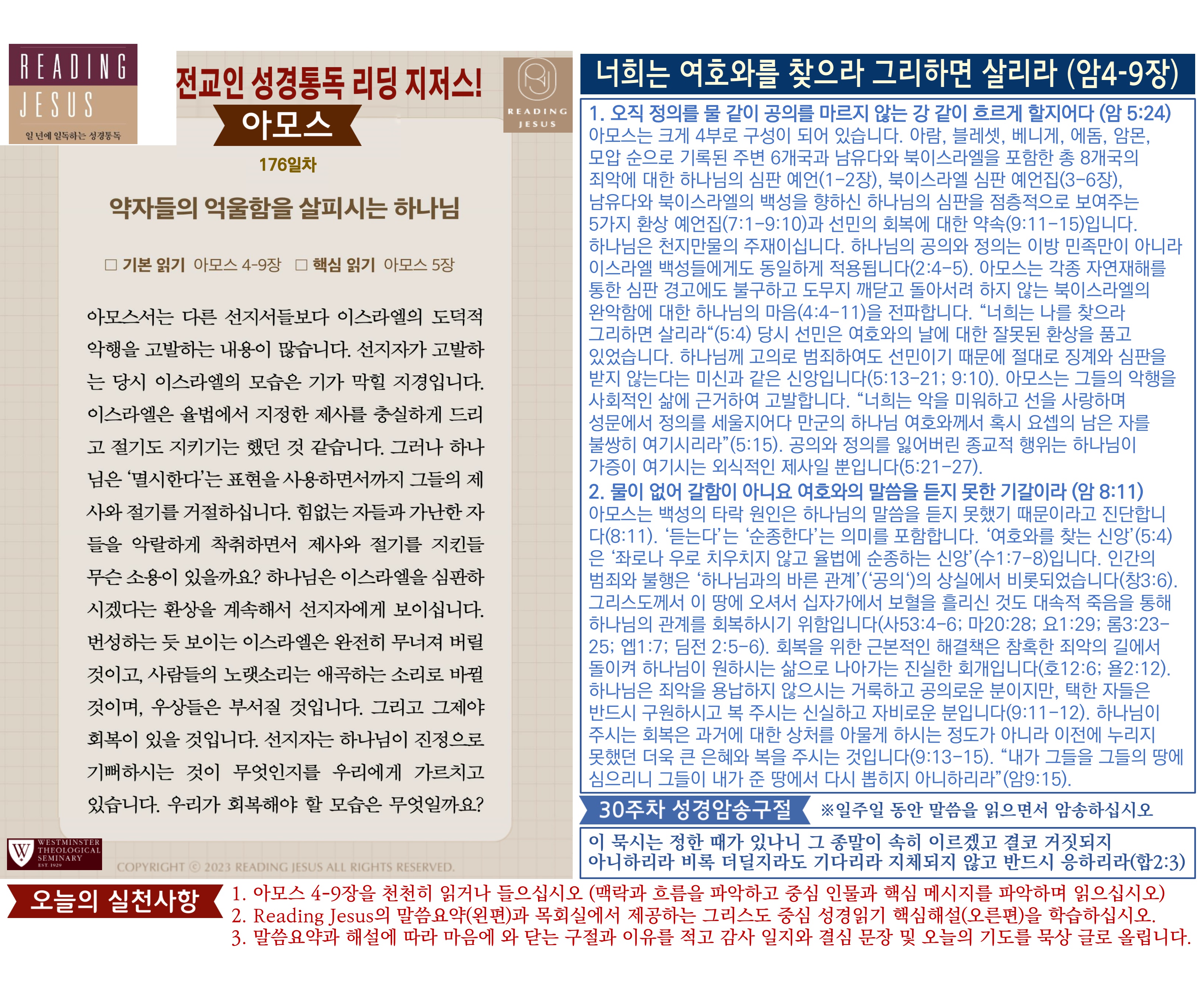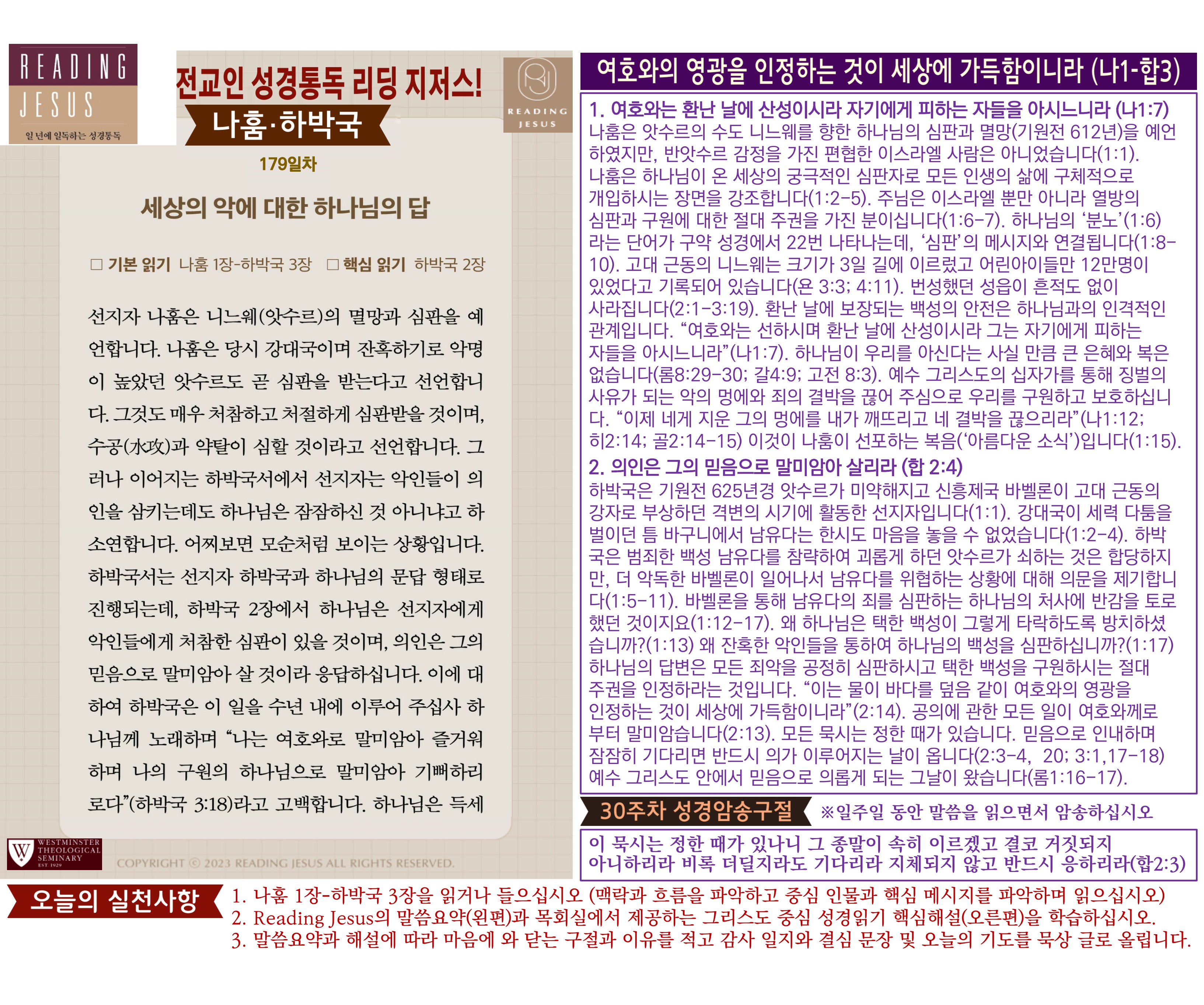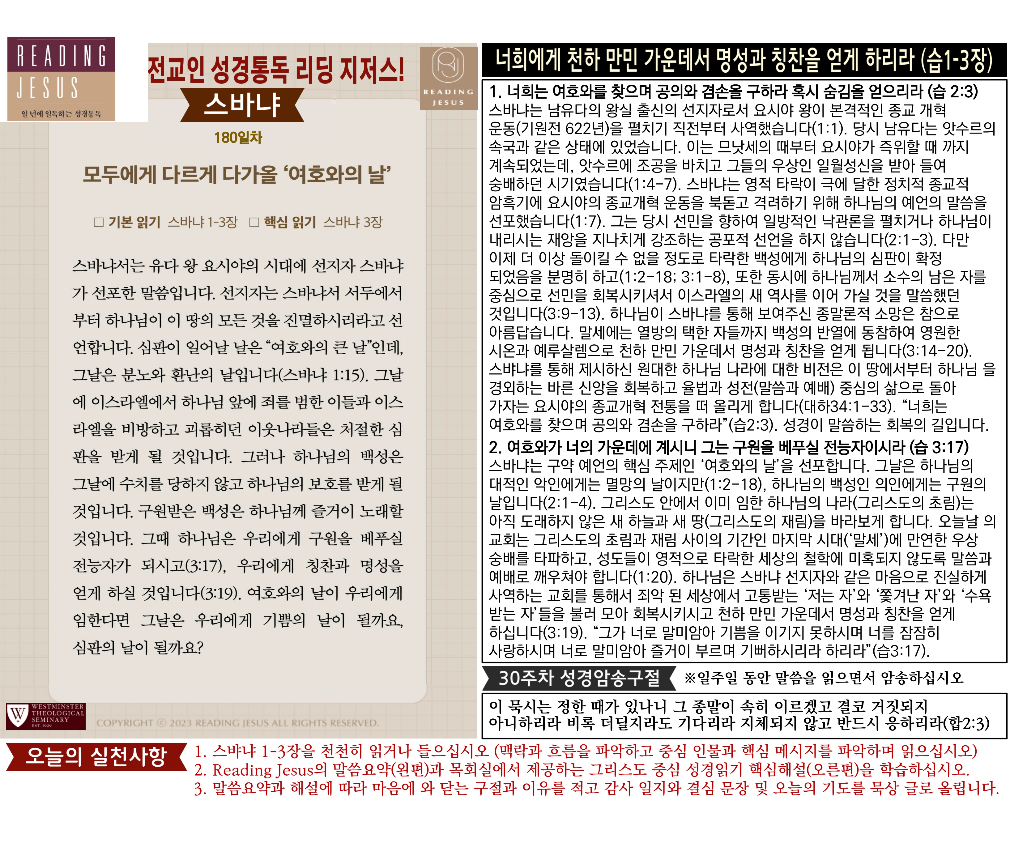 그리스도 중심 성경읽기, 리딩지저스 말씀 요약 | 30주차 : 요엘 아모스 오바댜 요나 미가 나훔 하박국 스바냐 관리자 교재와 해설 0 3 4시간전 그리스도 중심 성경읽기, 리딩지저스 말씀 요약 | 30주차 : 요엘 아모스 오바댜 요나 미가 나훔 하박국 스바냐 Author 1 1 Lv.77 관리자 최고관리자 369,330 (96.8%) 너희 안에 이 마음을 품으라 곧 그리스도 예수의 마음이니(빌립보서 2:5) Let this mind be in you, which was also in Christ Jesus(Philippians 2:5)