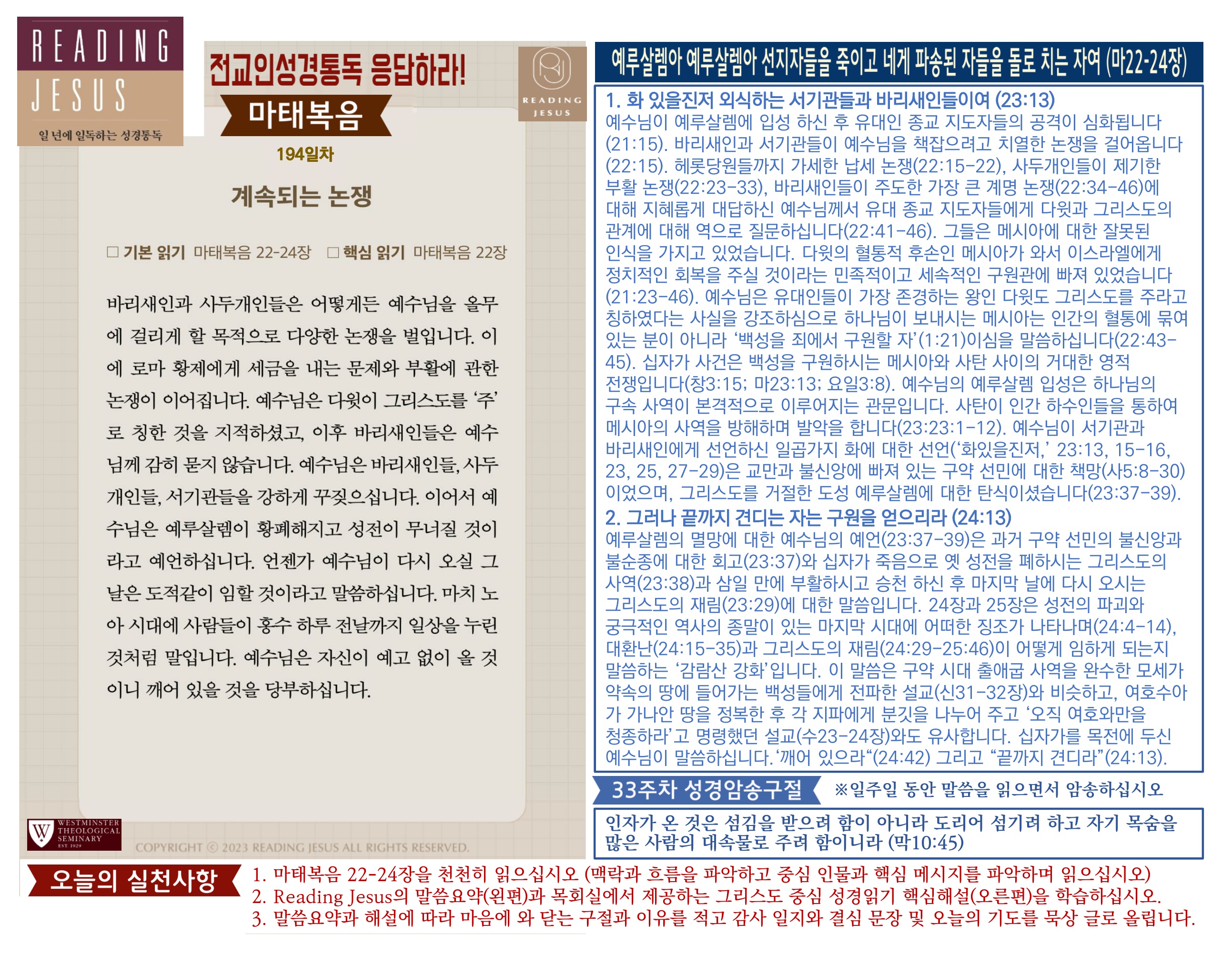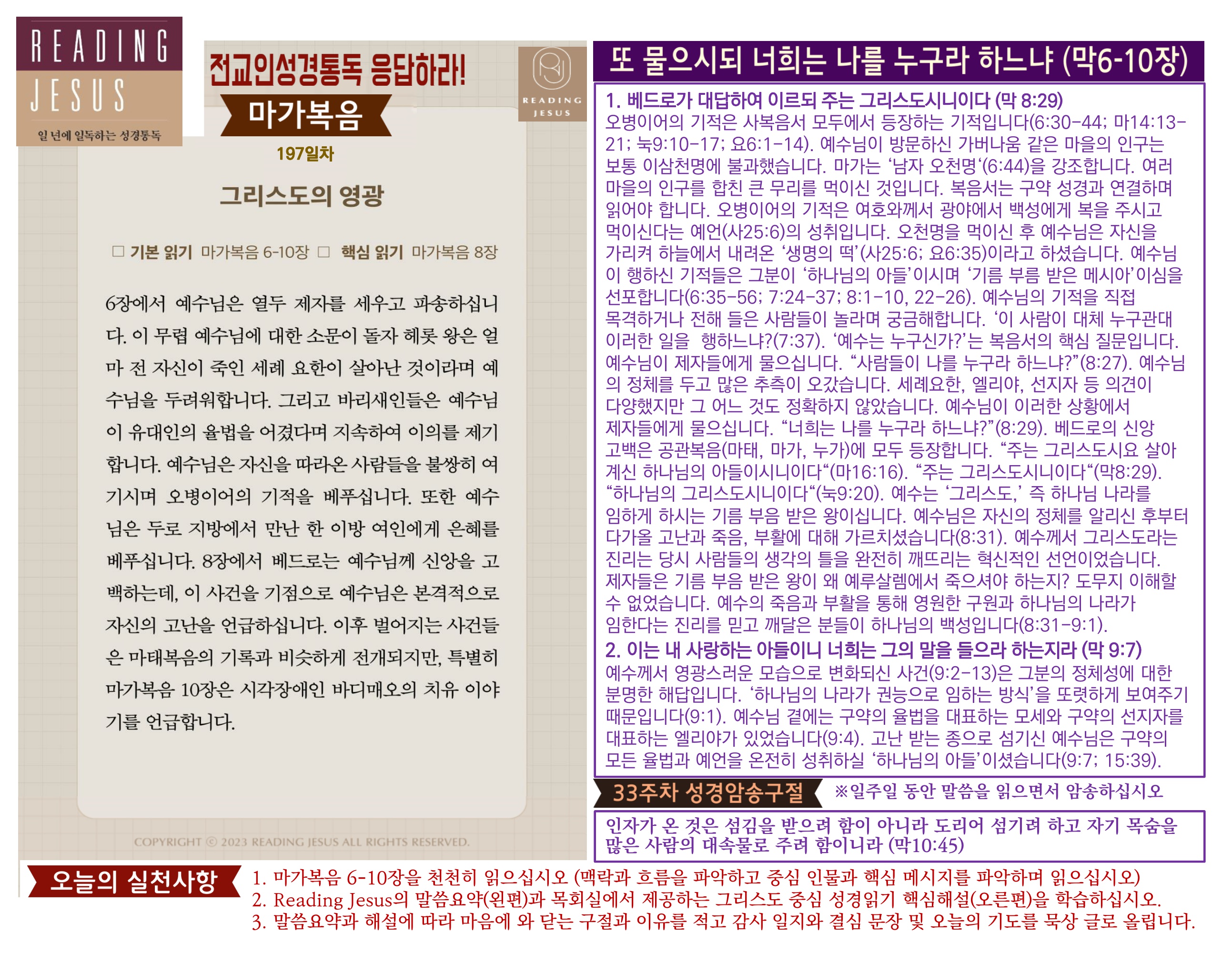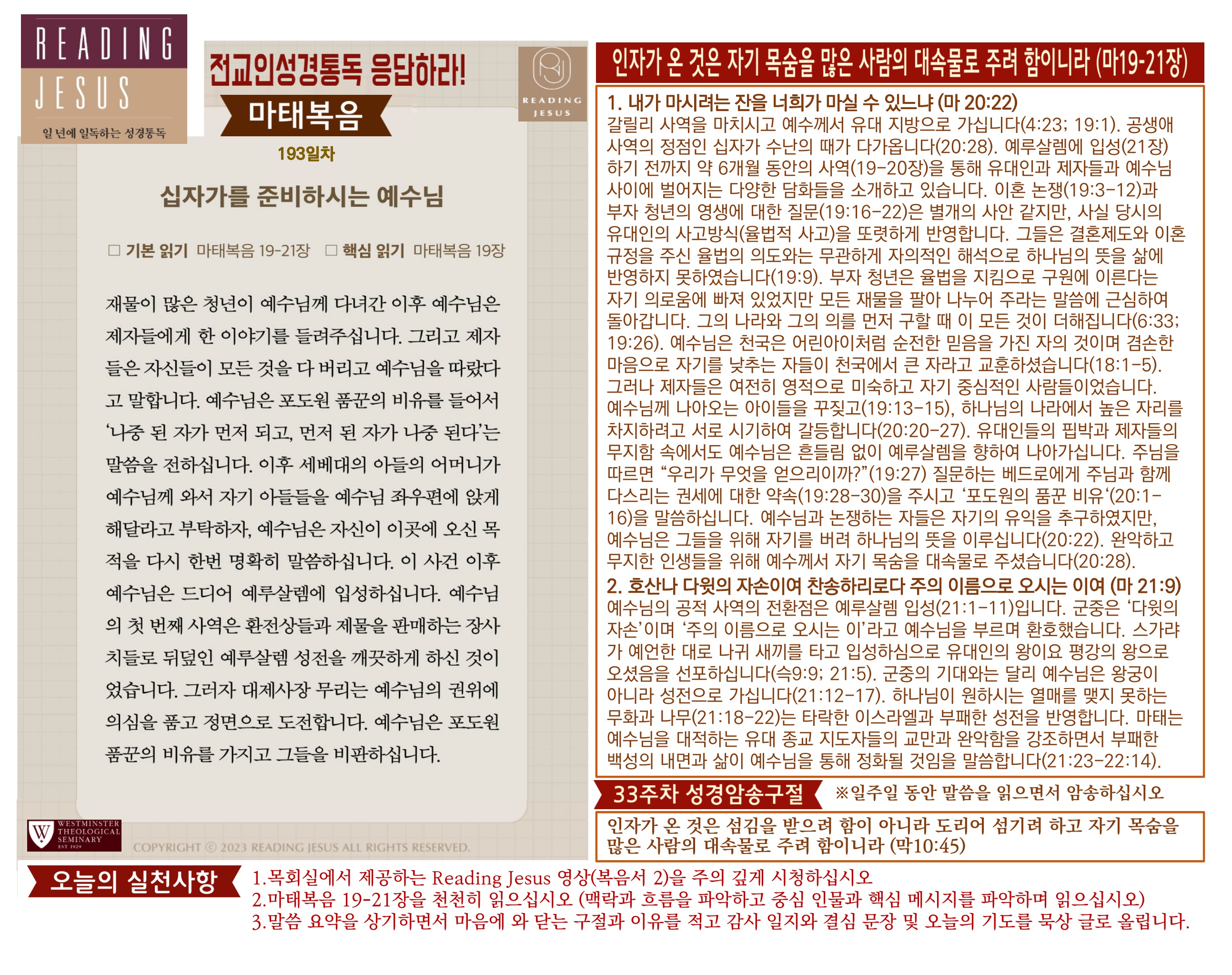 그리스도 중심 성경읽기, 리딩지저스 말씀 요약 | 33주차 : 마태복음2 마가복음 관리자 교재와 해설 0 152 04.07 04:07 Author 1 1 Lv.78 관리자 최고관리자 371,280 (19.3%) 너희 안에 이 마음을 품으라 곧 그리스도 예수의 마음이니(빌립보서 2:5) Let this mind be in you, which was also in Christ Jesus(Philippians 2:5)