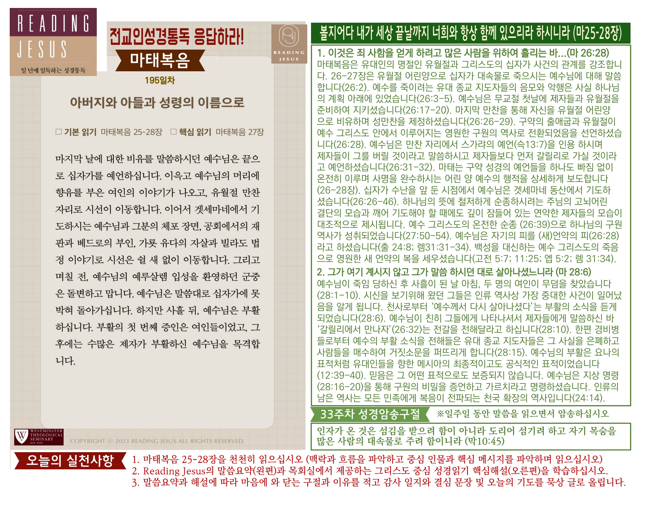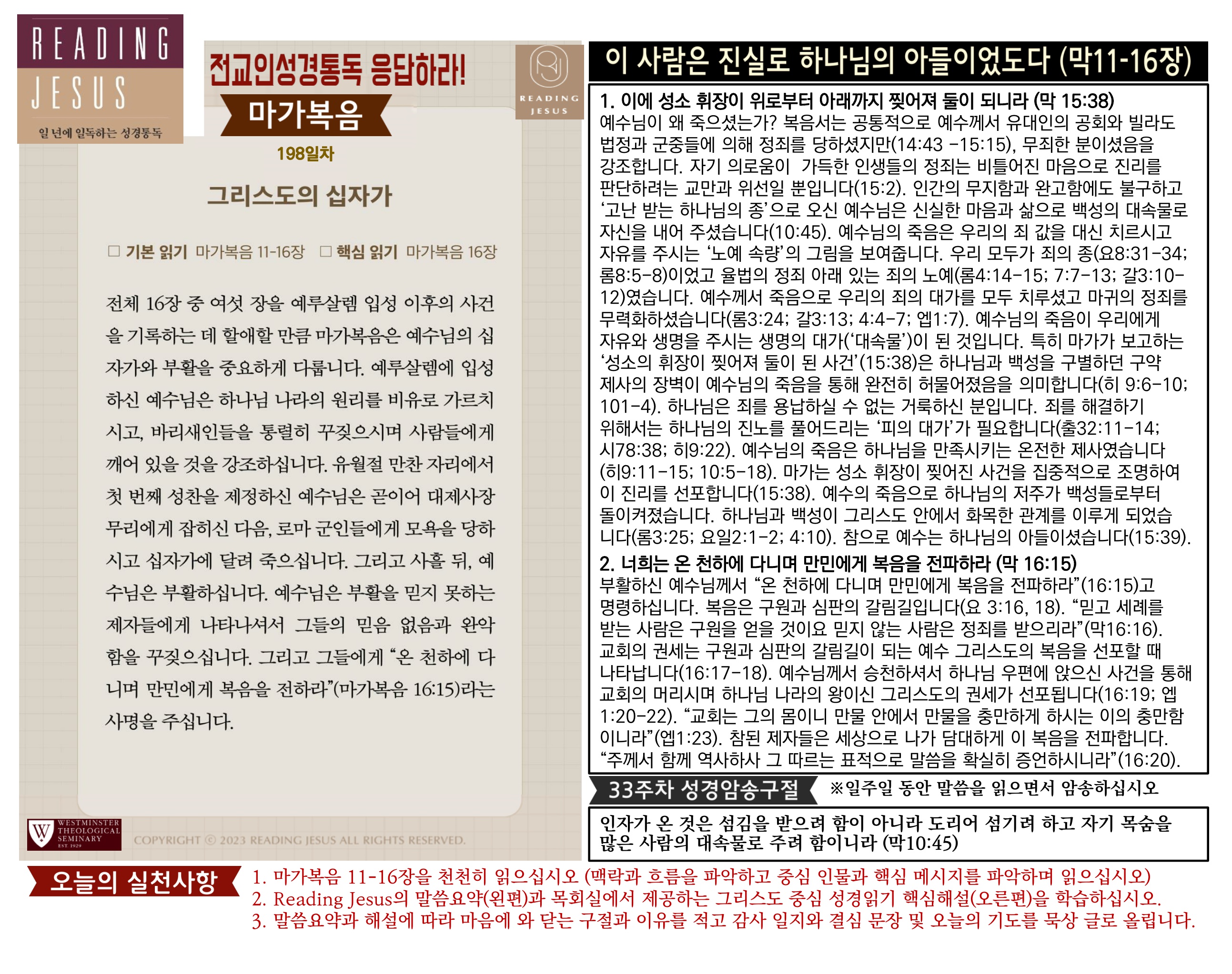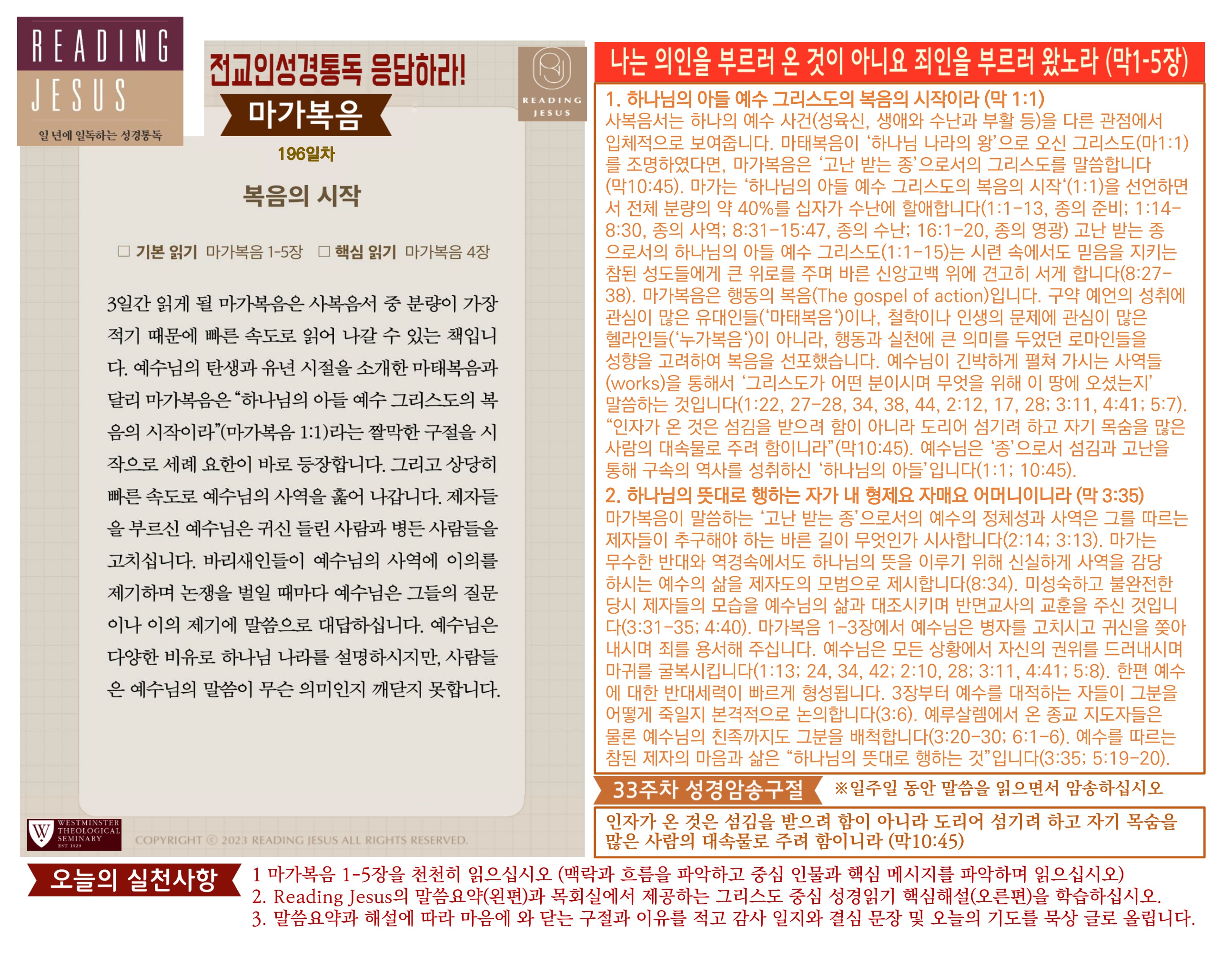 그리스도 중심 성경읽기, 리딩지저스 말씀 요약 | 33주차 : 마태복음2 마가복음 관리자 교재와 해설 0 152 04.07 04:07 Author 1 1 Lv.78 관리자 최고관리자 371,280 (19.3%) 너희 안에 이 마음을 품으라 곧 그리스도 예수의 마음이니(빌립보서 2:5) Let this mind be in you, which was also in Christ Jesus(Philippians 2:5)