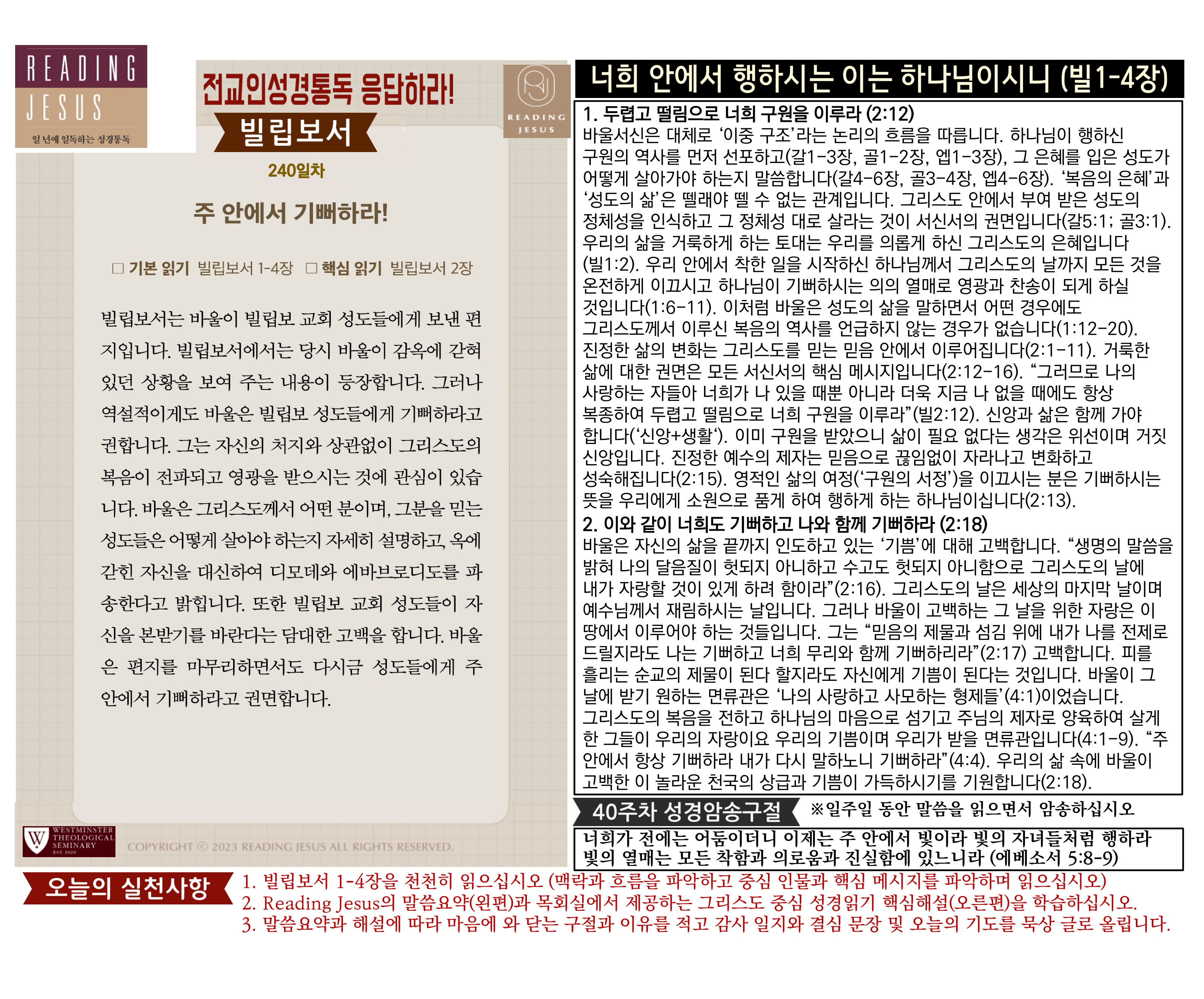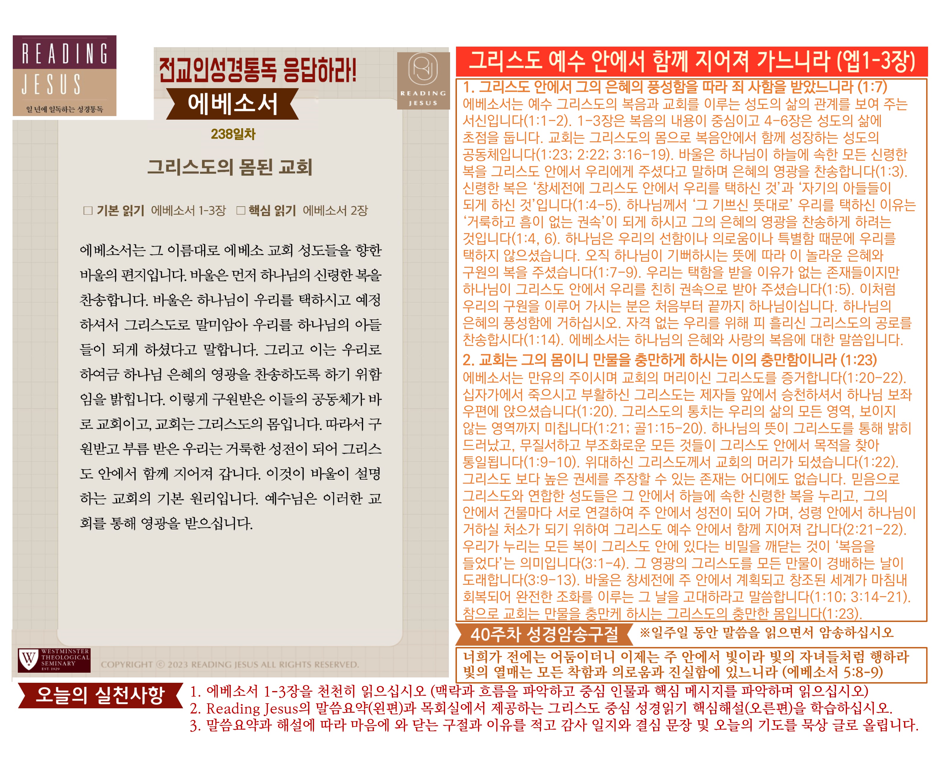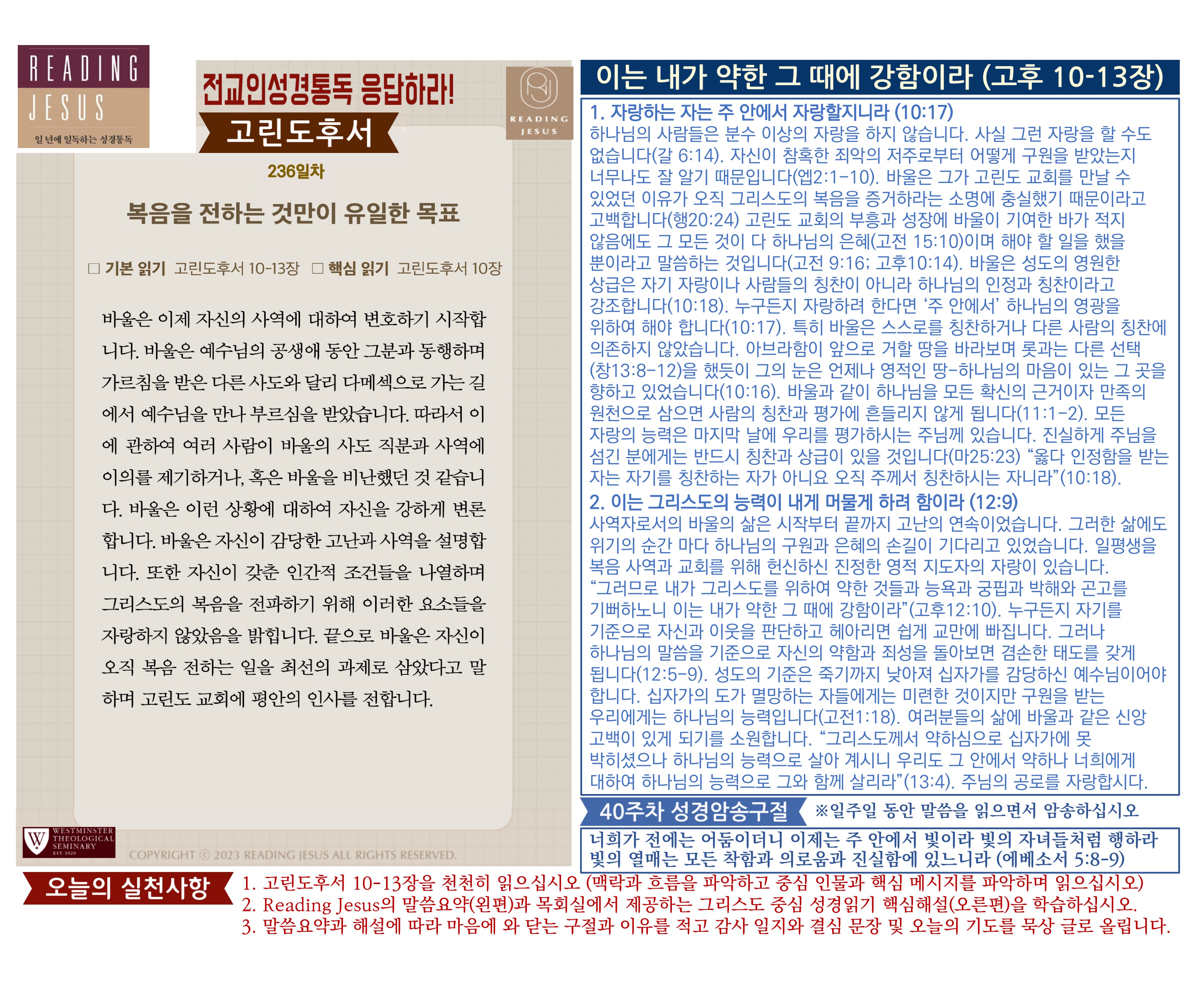 그리스도 중심 성경읽기, 리딩지저스 말씀 요약 | 40주차 : 고린도후서 갈라디아서 에베소서 빌립보서 관리자 교재와 해설 0 124 04.09 18:37 그리스도 중심 성경읽기, 리딩지저스 말씀 요약 | 40주차 : 고린도후서 갈라디아서 에베소서 빌립보서 Author 1 1 Lv.78 관리자 최고관리자 371,280 (19.3%) 너희 안에 이 마음을 품으라 곧 그리스도 예수의 마음이니(빌립보서 2:5) Let this mind be in you, which was also in Christ Jesus(Philippians 2:5)