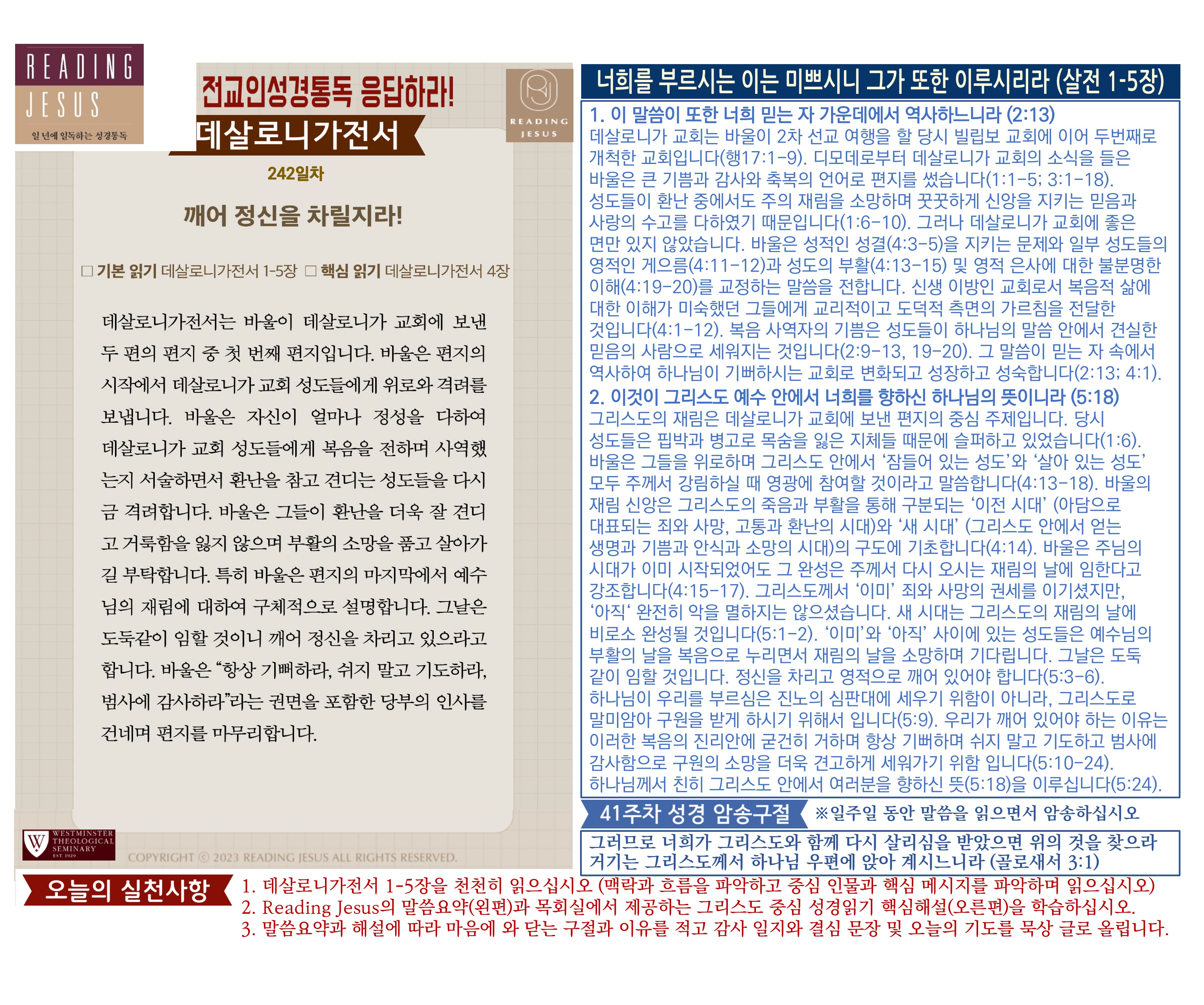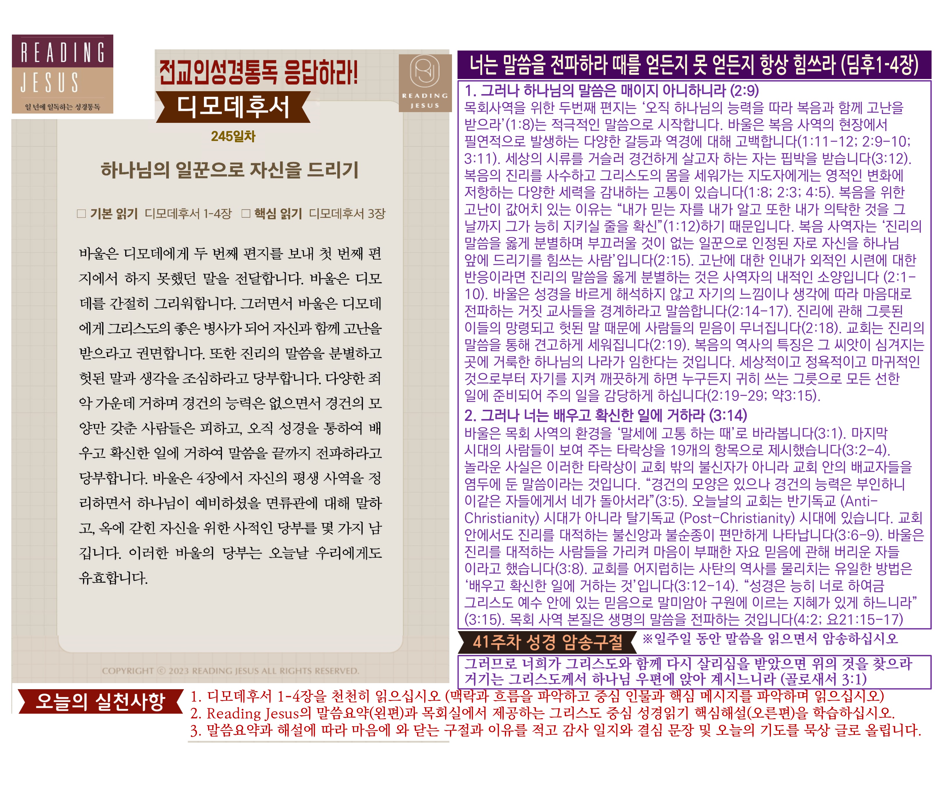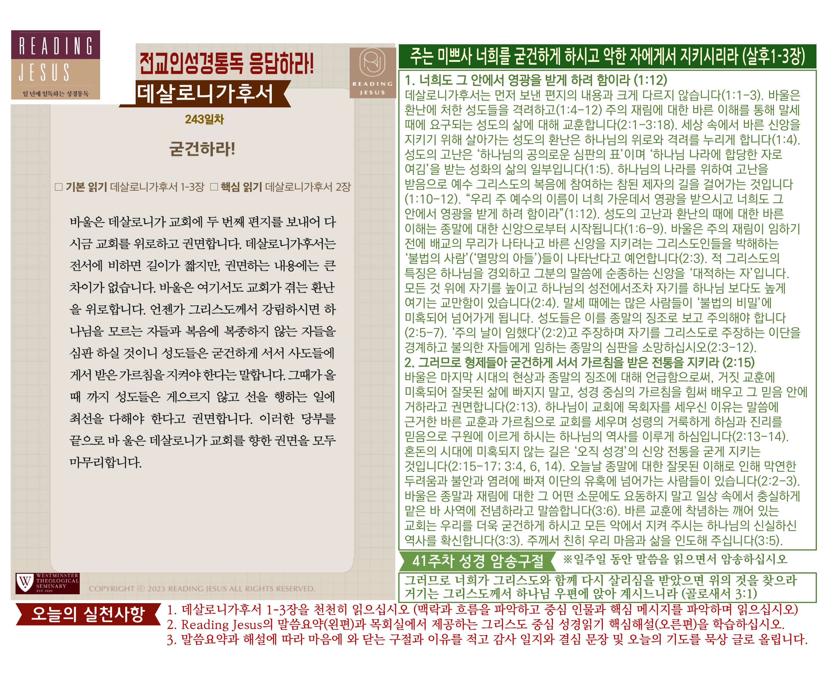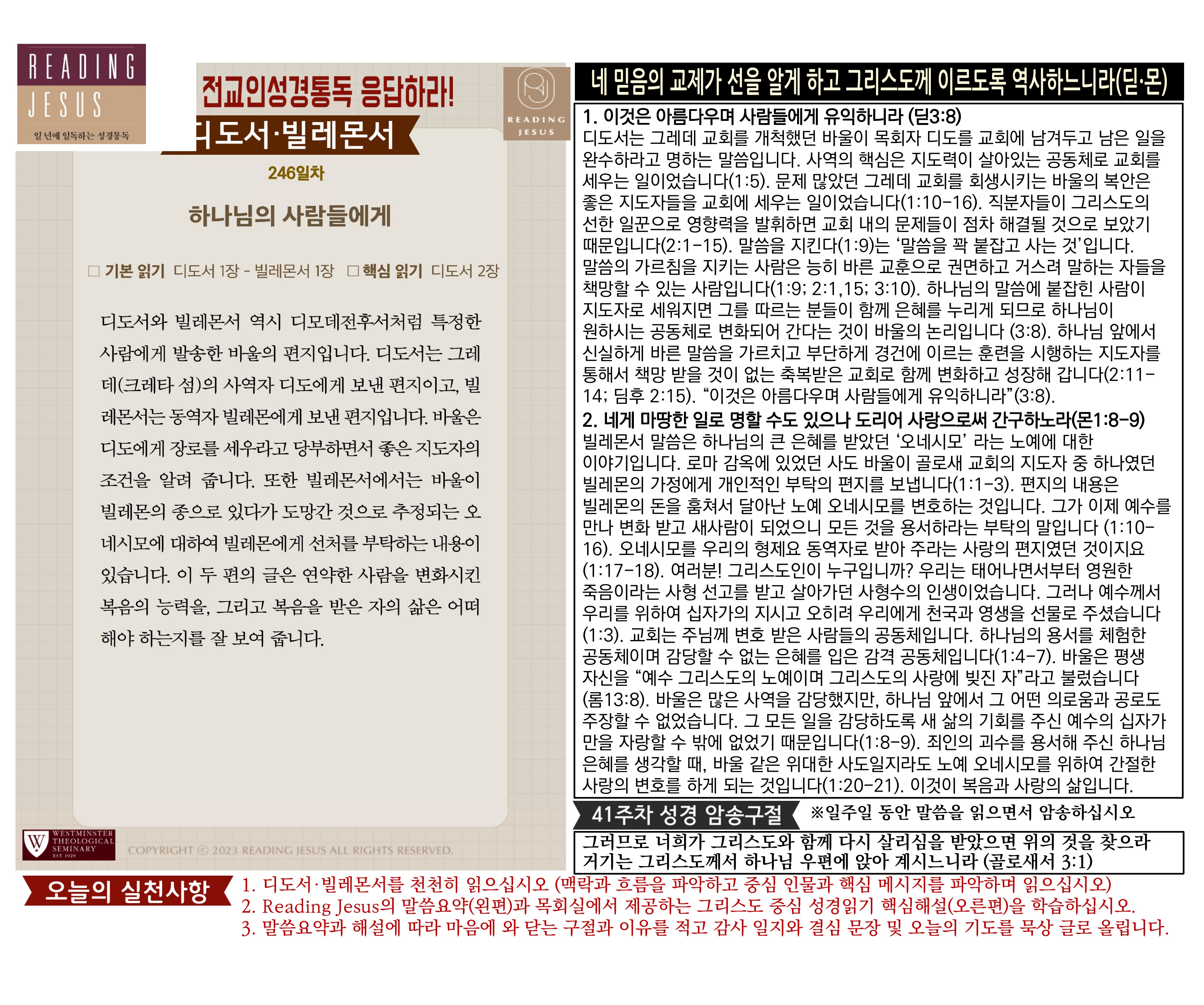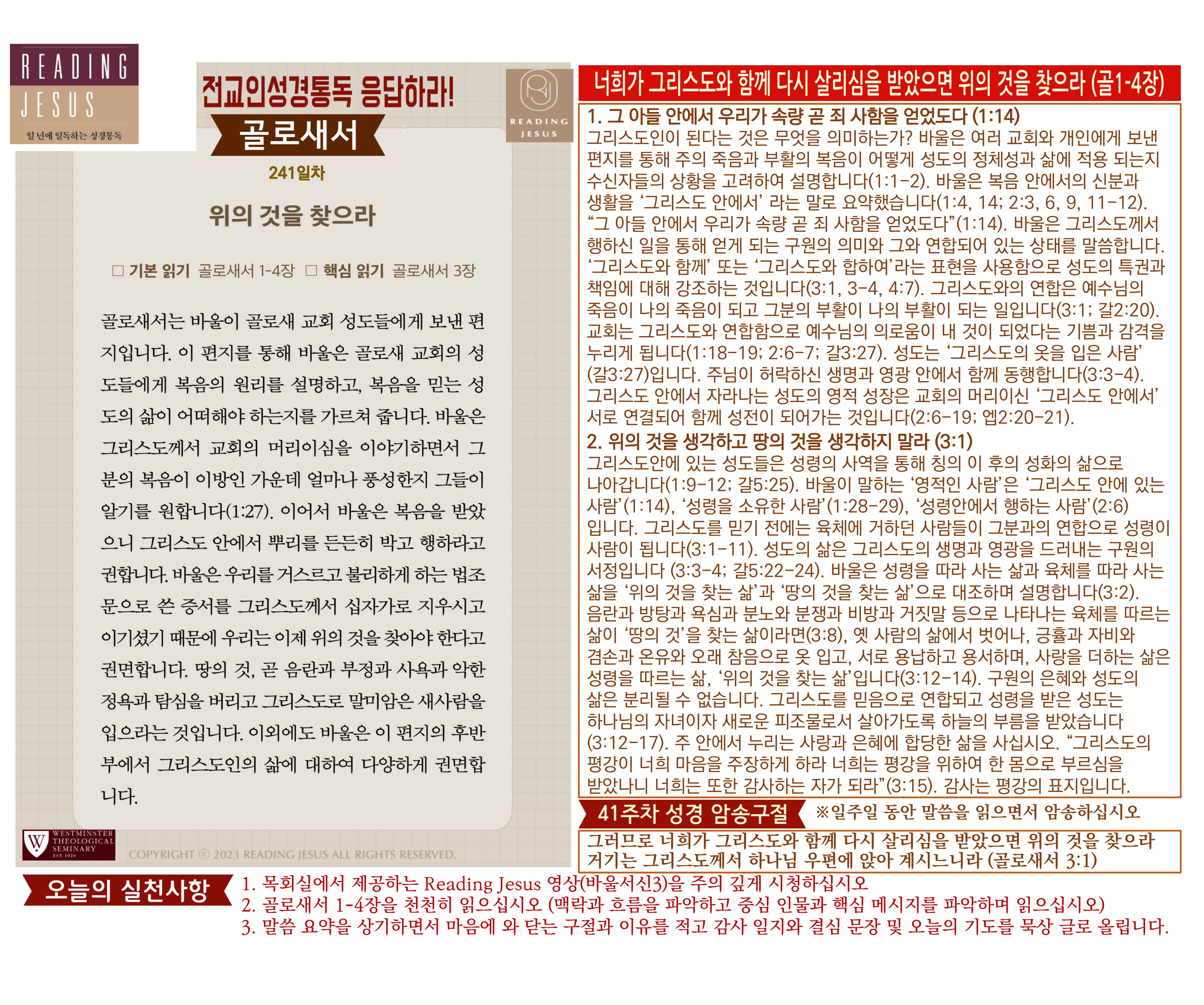 그리스도 중심 성경읽기, 리딩지저스 말씀 요약 | 41주차 : 골로새서 데살로니가전서 후서 디모데 전서 후서 디도서 빌레몬서 관리자 교재와 해설 0 117 04.09 18:40 그리스도 중심 성경읽기, 리딩지저스 말씀 요약 | 41주차 : 골로새서 데살로니가전서 후서 디모데 전서 후서 디도서 빌레몬서 Author 1 1 Lv.78 관리자 최고관리자 371,280 (19.3%) 너희 안에 이 마음을 품으라 곧 그리스도 예수의 마음이니(빌립보서 2:5) Let this mind be in you, which was also in Christ Jesus(Philippians 2:5)